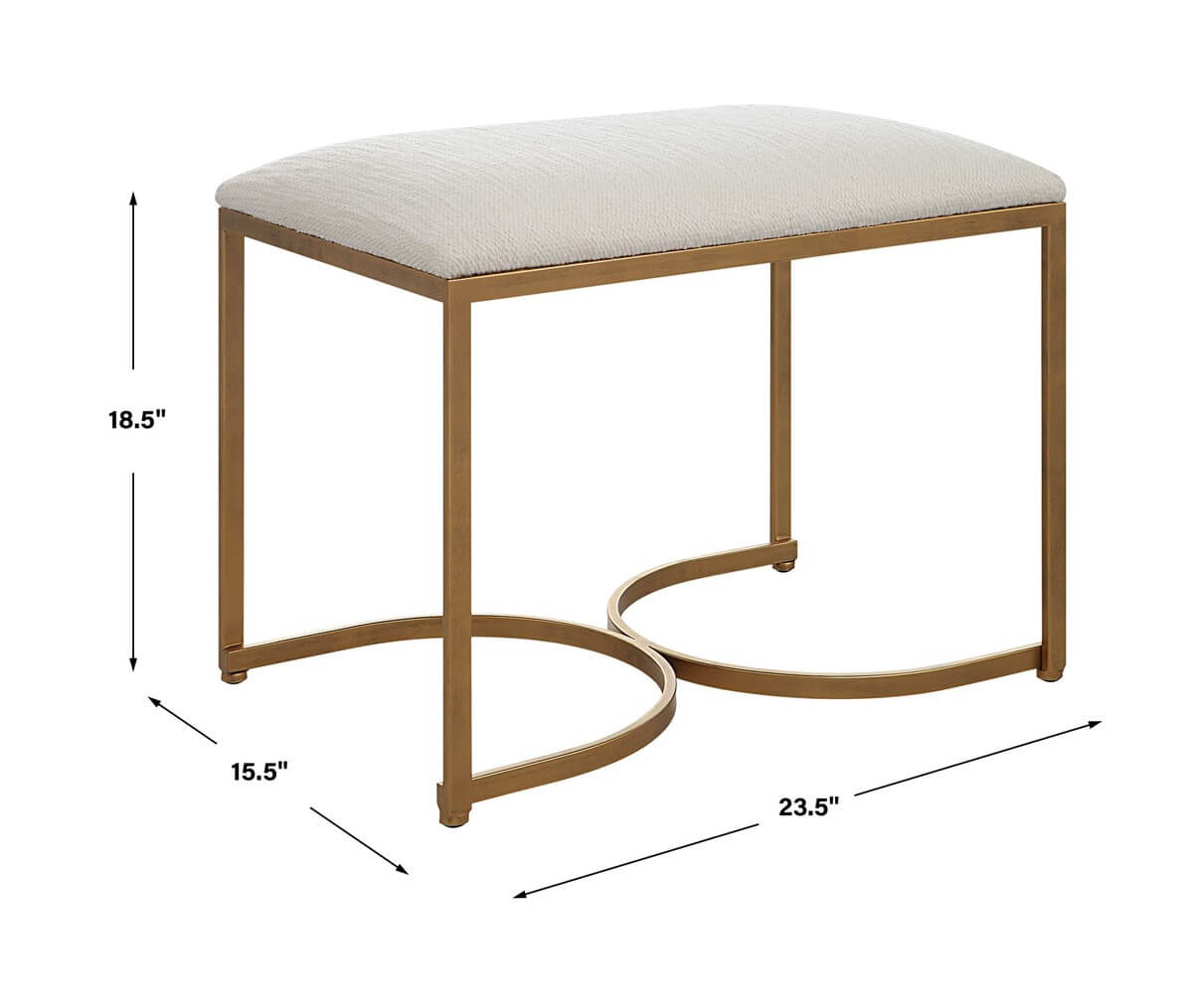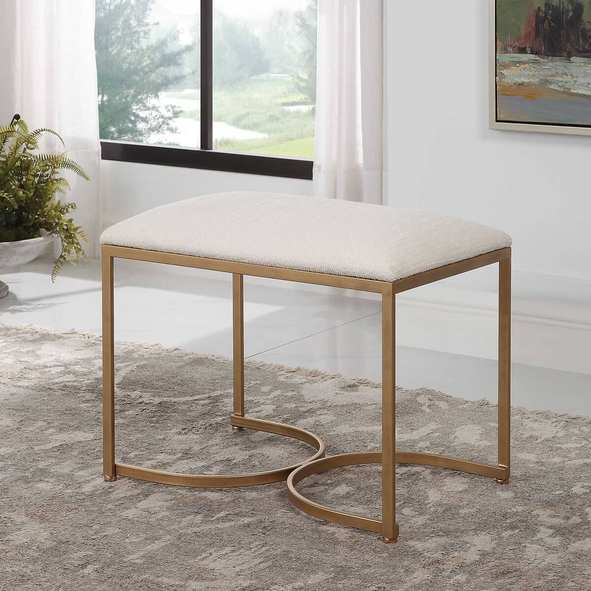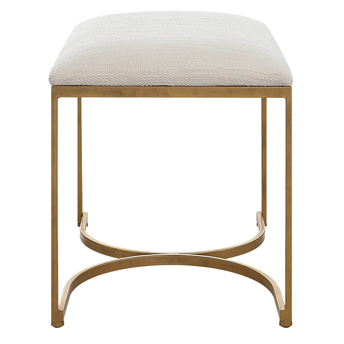 Half circle designs form the base of this iron accent bench. The antique brushed brass finish is complemented with a cushioned top upholstered in a crisp white fabric.