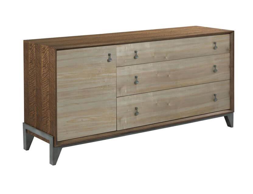 Nouveau dresser with walnut framed panels and ambrosia maple drawer fronts with metal base adds to the appeal of this great storage piece with drawers and door storage.