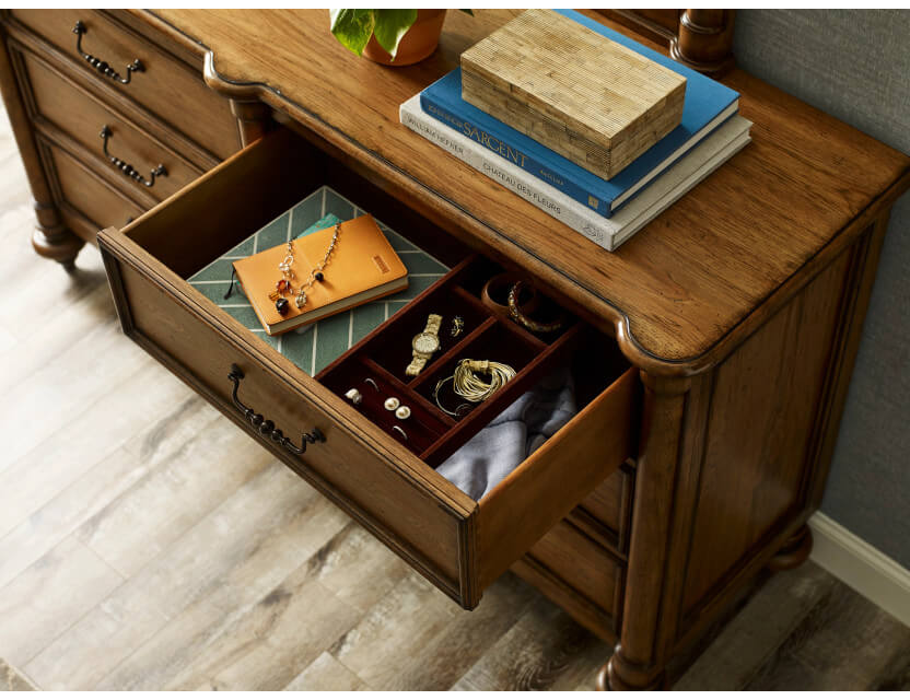 The Mayview Dresser is comprised of Rubberwood solids and Hickory veneers and is finished in a warm Cognac finish. To further bring out the beauty of this piece, we have added the classic bail and rosette hardware. This piece is designed with six drawers for storage, adjustable levelers and a center foot for stability. It has a removeable jewelry tray in the top right drawer, bottom two drawers are cedar lined. We have equipped this piece with hand holds in the back for easy mobility.