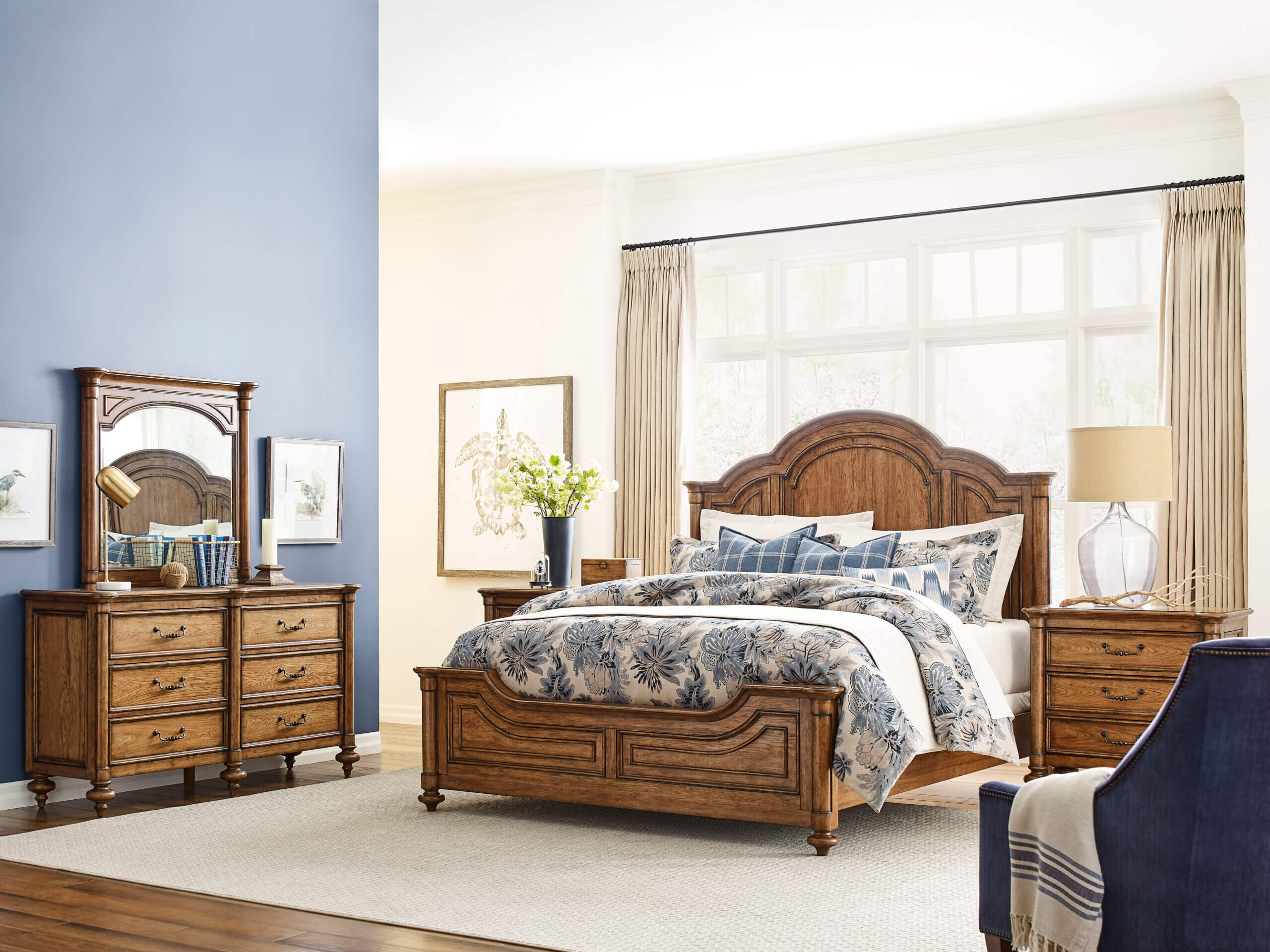 The Mayview Mirror features an elegant beveled mirror surrounded by mitered wood moldings in a warm cognac finish.