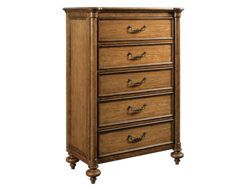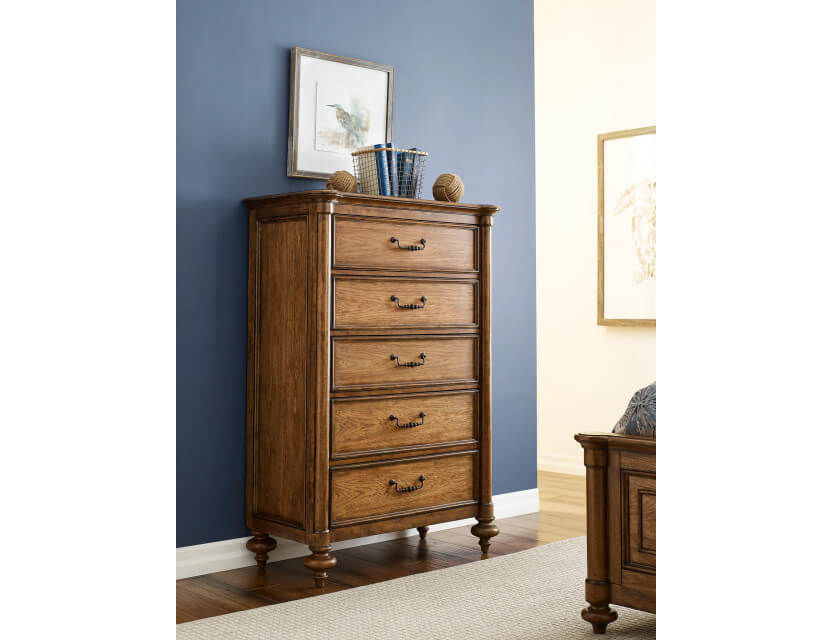 The Penley Drawer Chest is comprised of Rubberwood solids and Hickory veneers and is finished in a warm Cognac finish. To further bring out the beauty of this piece, we have added the classic bail and rosette hardware. This piece has five drawers for storage with the second and third drawer from the top having drawer dividers. The bottom drawer is Cedar lined. We have added hand holds in the back for easy mobility and adjustable levelers.