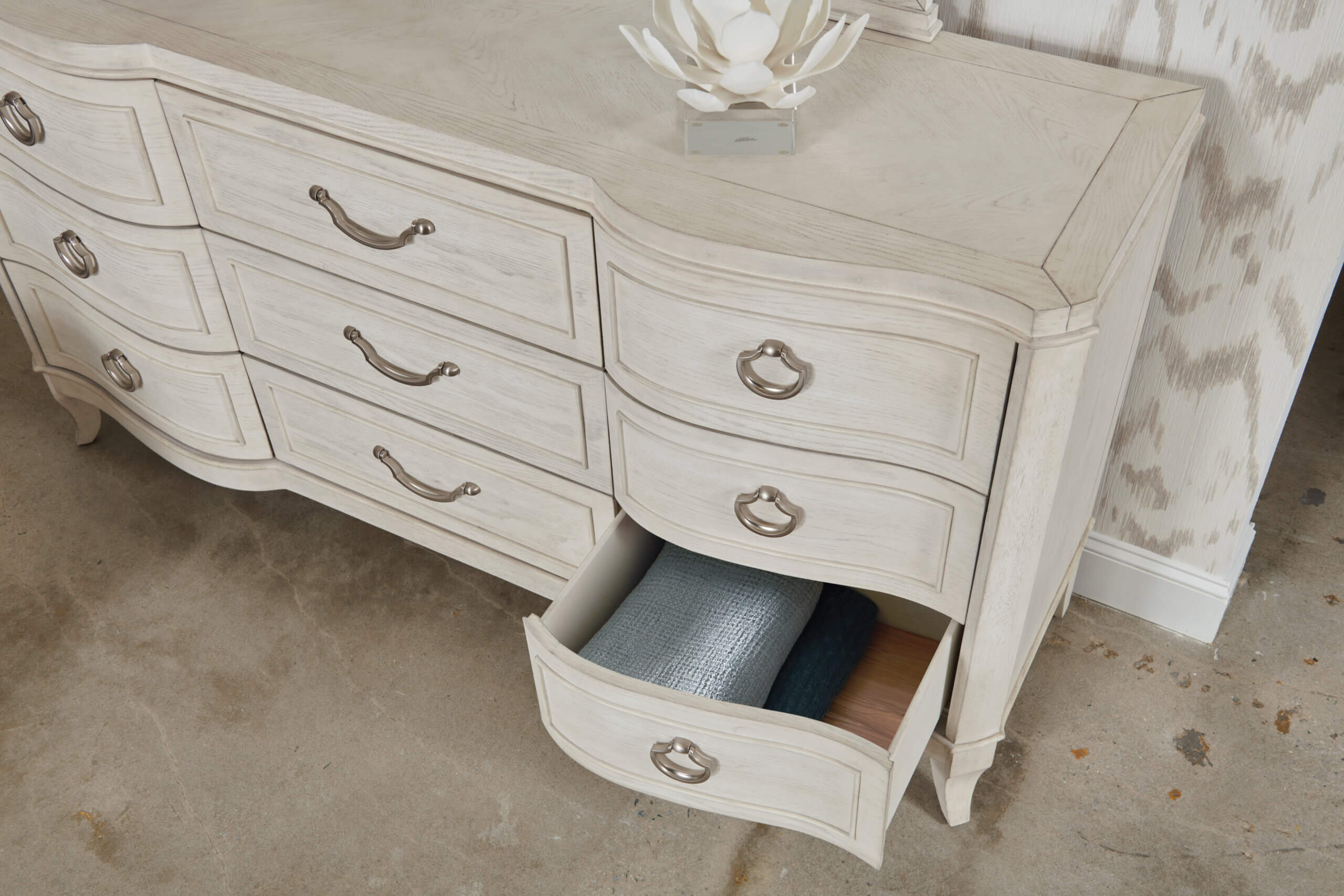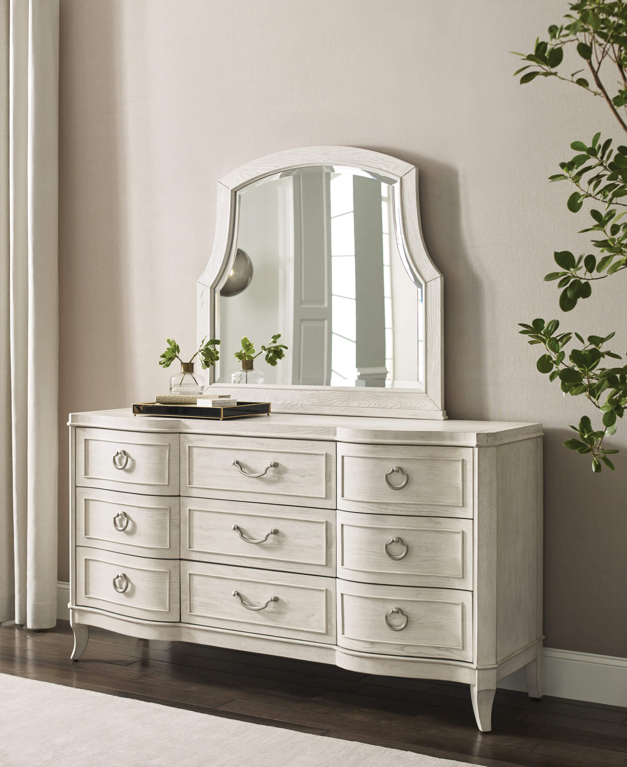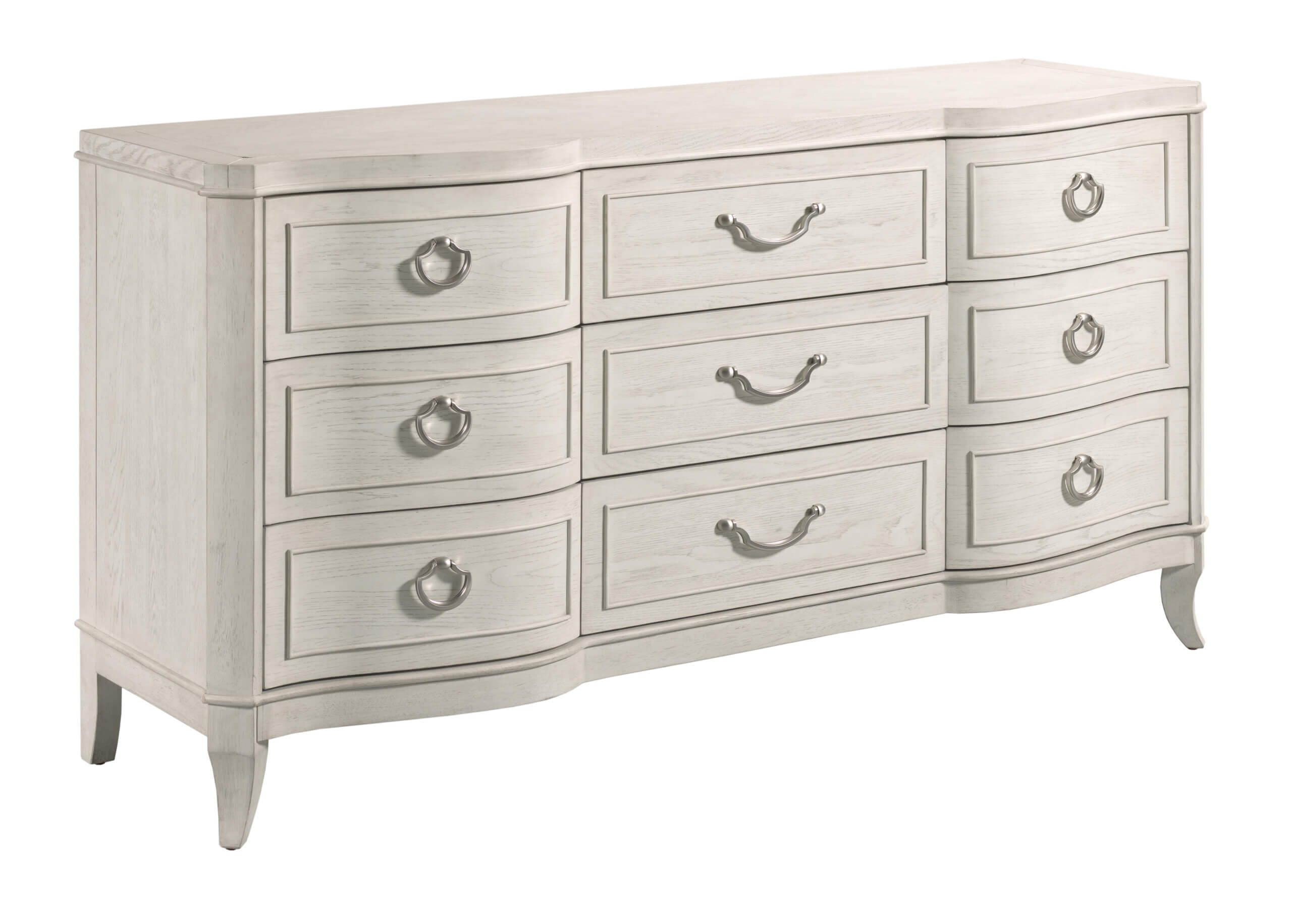 This dresser is comprised of cathedral white oak veneers and topped off in an Eggshell finish. To further bring out the beauty of this piece it has a serpentine shaped front with Satin Nickel hardware. This dresser is also designed with a removable jewelry tray in the top center drawer, cedar lined drawers in the bottom three drawers, adjustable levelers and a center foot for stability.