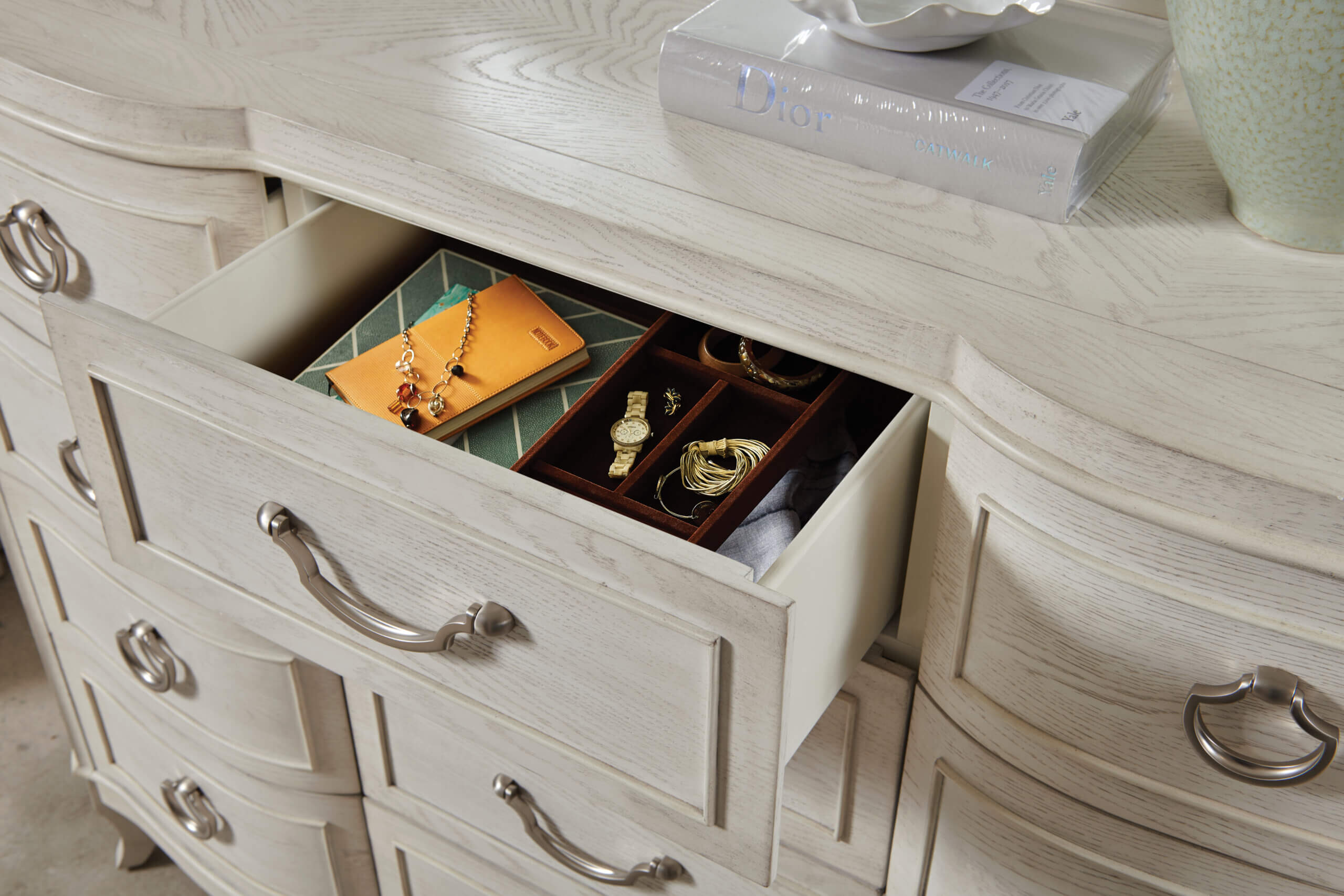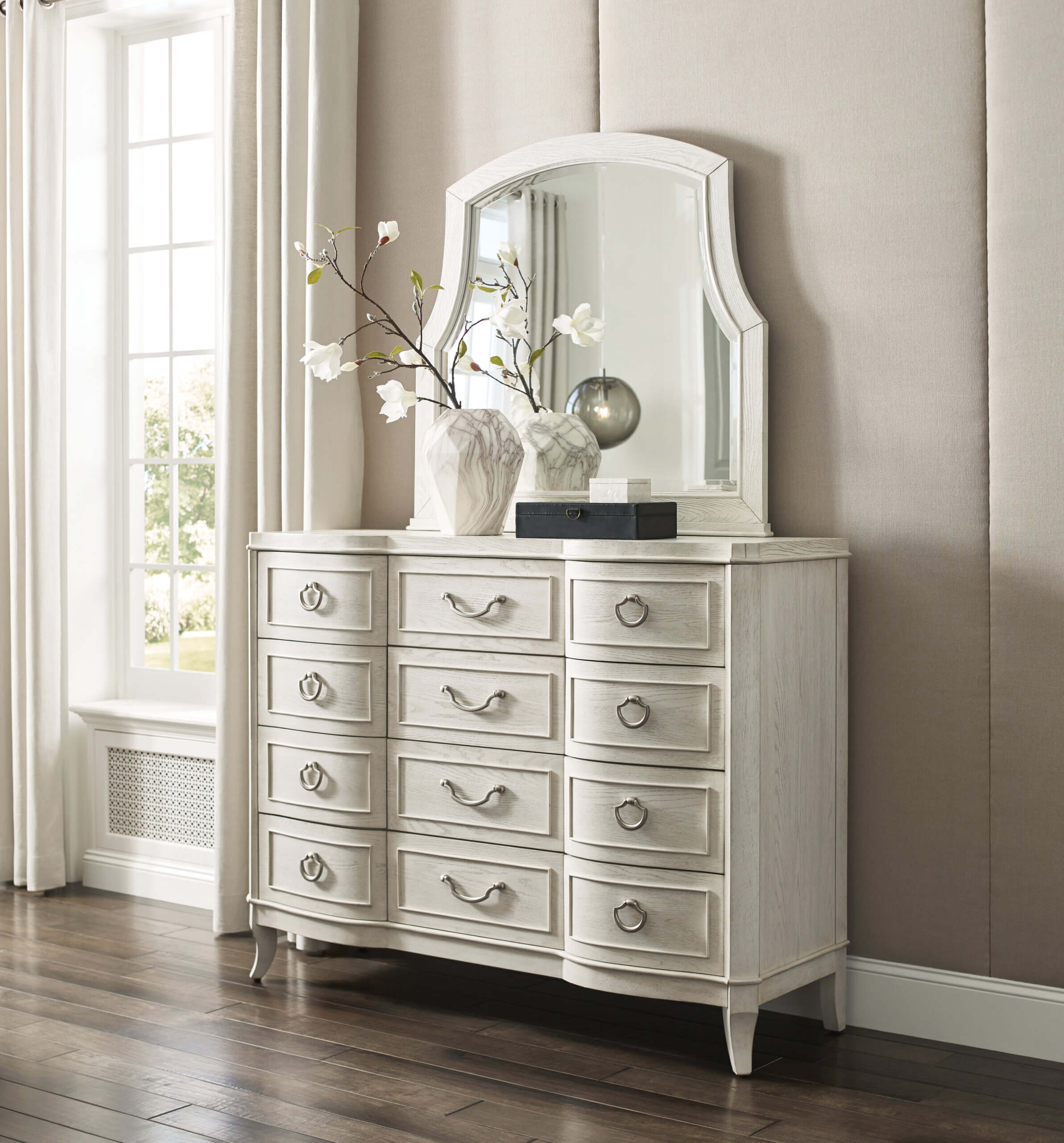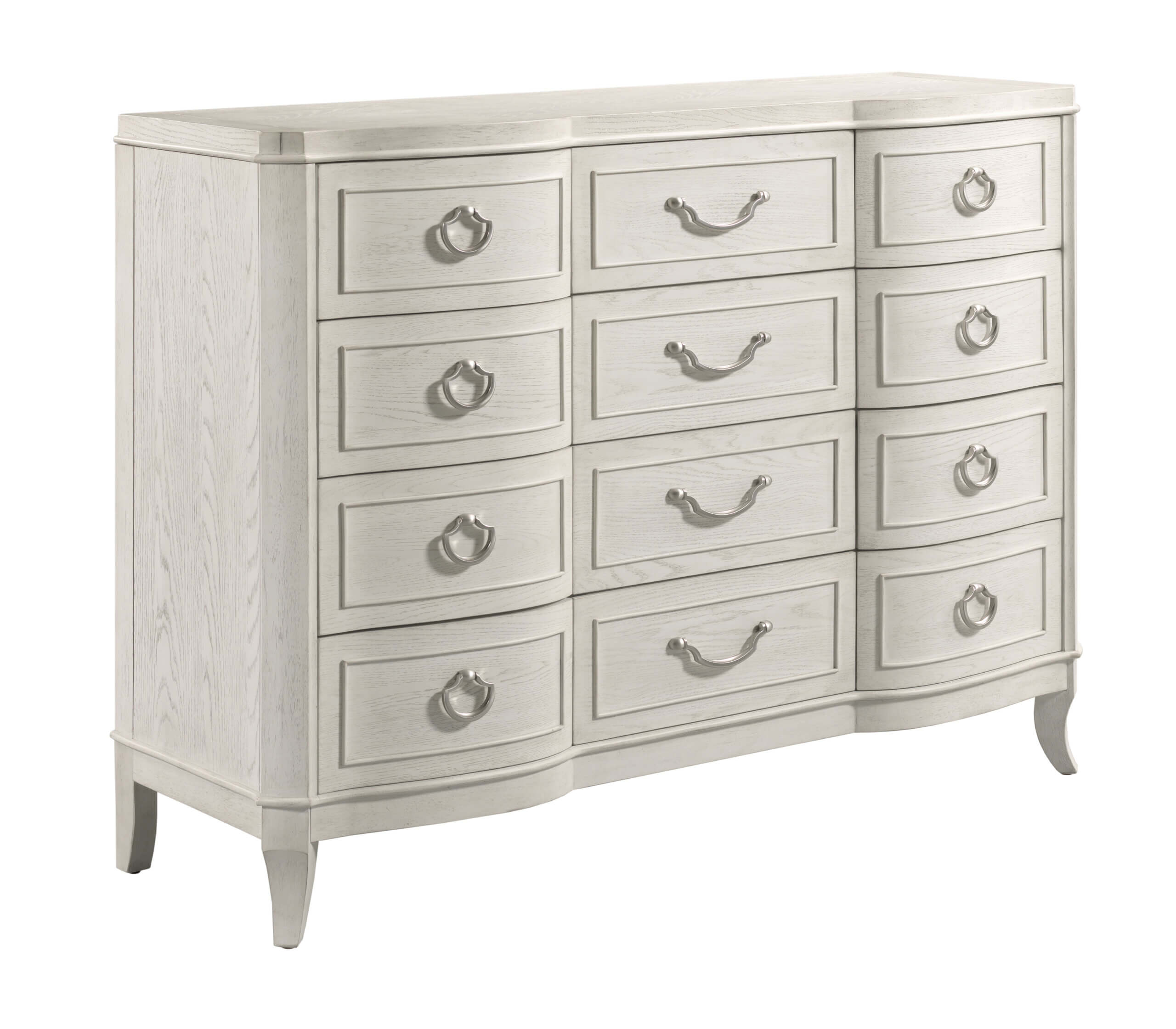 Beautifully crafted with a serpentine shape and elegant tapered saber legs and raised bead, this dresser will add sophistication to your bedroom. It is constructed of cathedral white oak veneers in an Eggshell finish, and comes equipped with a removable jewelry tray in the top center drawer, cedar lined bottom drawers, adjustable levelers, and a center foot for stability.