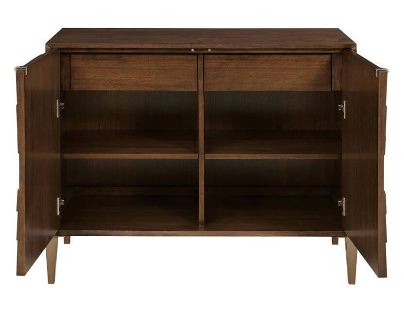 The Norwalk Door Chest features two doors. Two interior drawers and adjustable shelf behind each door. Includes a brown felt insert in each drawer. Metal legs. Adjustable levelers and hand holds in the back of the case.