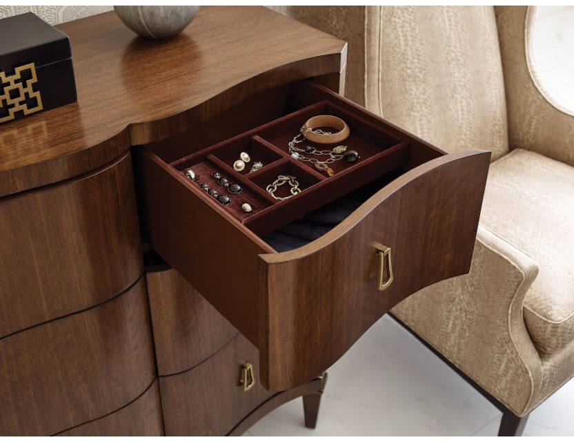 The Richmond dresser features nine drawers. The bottom three drawers are Cedar lined. A brown jewelry tray is provided in the top right drawer. Adjustable levelers; hand holds in the back of the case.