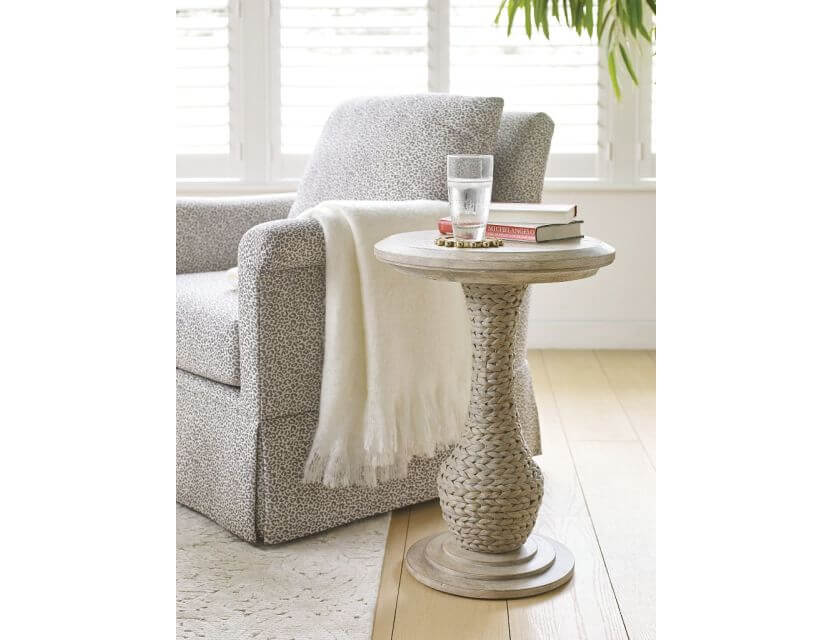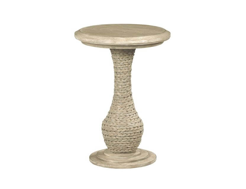 Casual transitional group by utilizing transitional styling with casual elements and accent pieces. Round end table with a woven seagrass pedestal and wooden base adds a different element to the group.