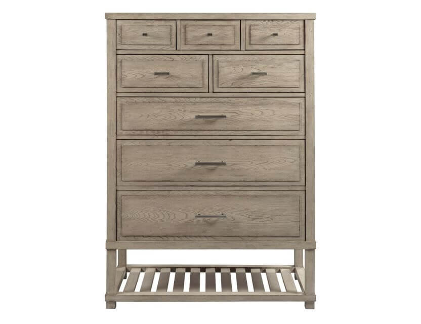 Greer chest is beautifully designed with slatted shelf on the bottom and eight drawers for storage. Adjustable levelers and bottom drawer is Cedar lined and perfect for any room in the home.