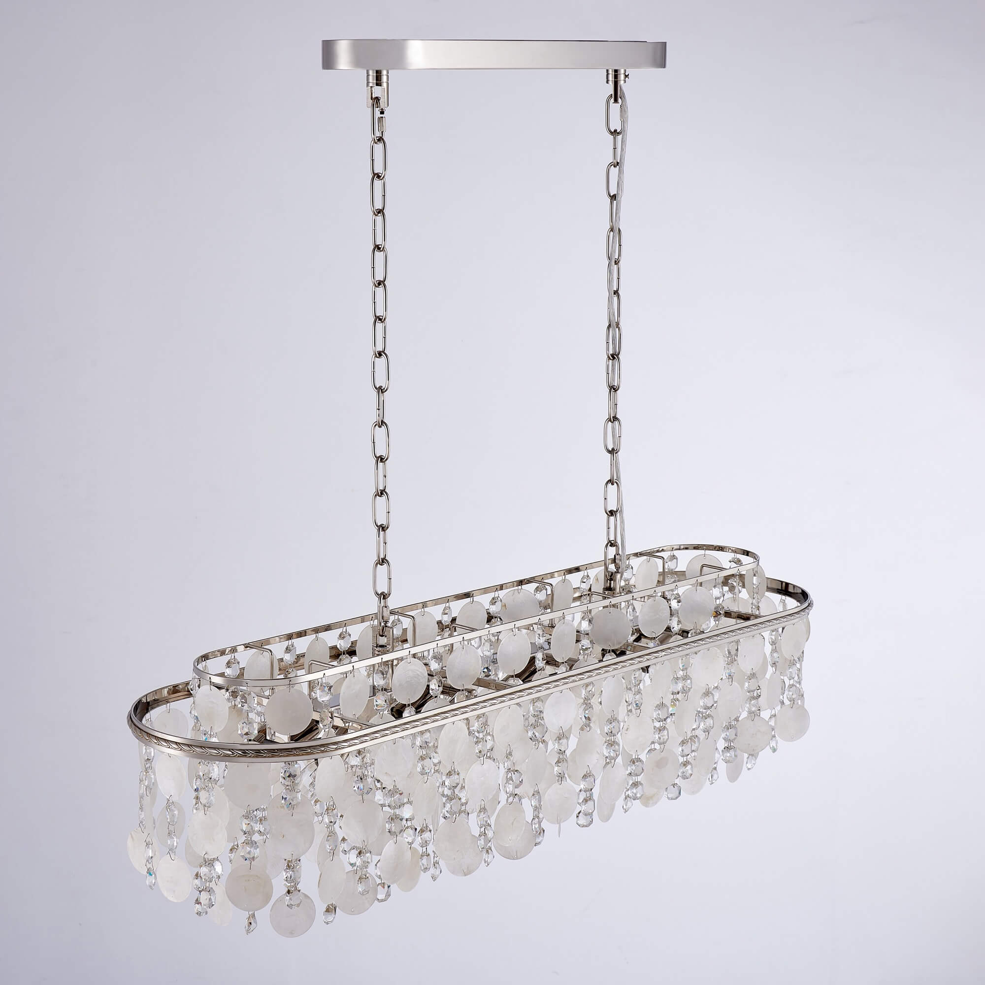 The Avara Collection features this exquisite linear island chandelier, a sophisticated statement piece that combines natural elements with classic luxury. The fixture is adorned with a stunning array of authentic Capiz shells and shimmering crystal jewels that beautifully catch and diffuse the light. These delicate, organic textures are elegantly supported by a sleek polished nickel frame, providing a radiant and high-end finish. This brilliant design makes it an ideal focal point for an upscale dining room or a modern kitchen island, blending coastal charm with refined elegance. Great for any rectangular table or island area.