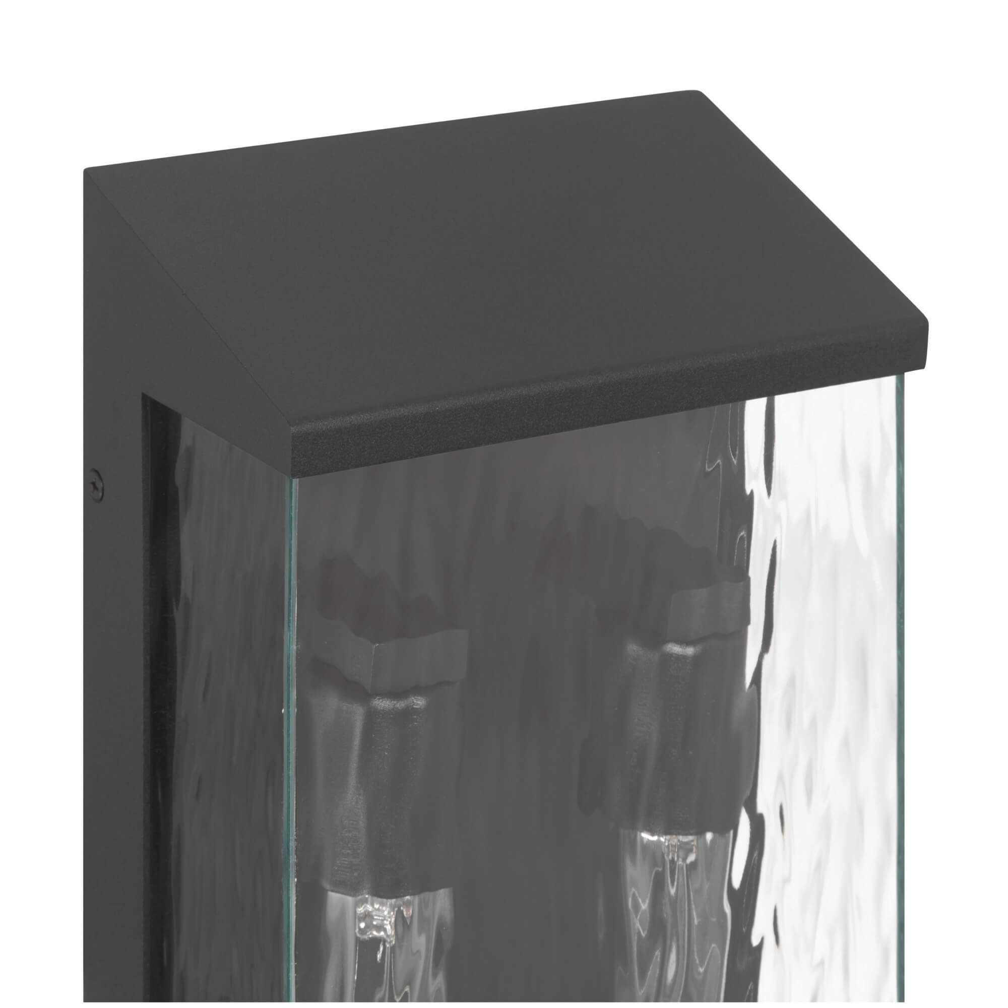 The Azure Bay collection from designer Kevin Kraemer, features this sophisticated outdoor wall sconce, designed to bring a modern yet classic touch to your home's exterior. The fixture is highlighted by unique water-type glassware that creates a beautiful, rippled light effect while providing a clean and artisanal look. Its structured matte black frame offers a bold, contemporary silhouette that ensures durability against the elements. This combination of textured glass and a refined finish makes it an ideal choice for enhancing both the security and curb appeal of entryways or patios.(Large size - smaller model available)