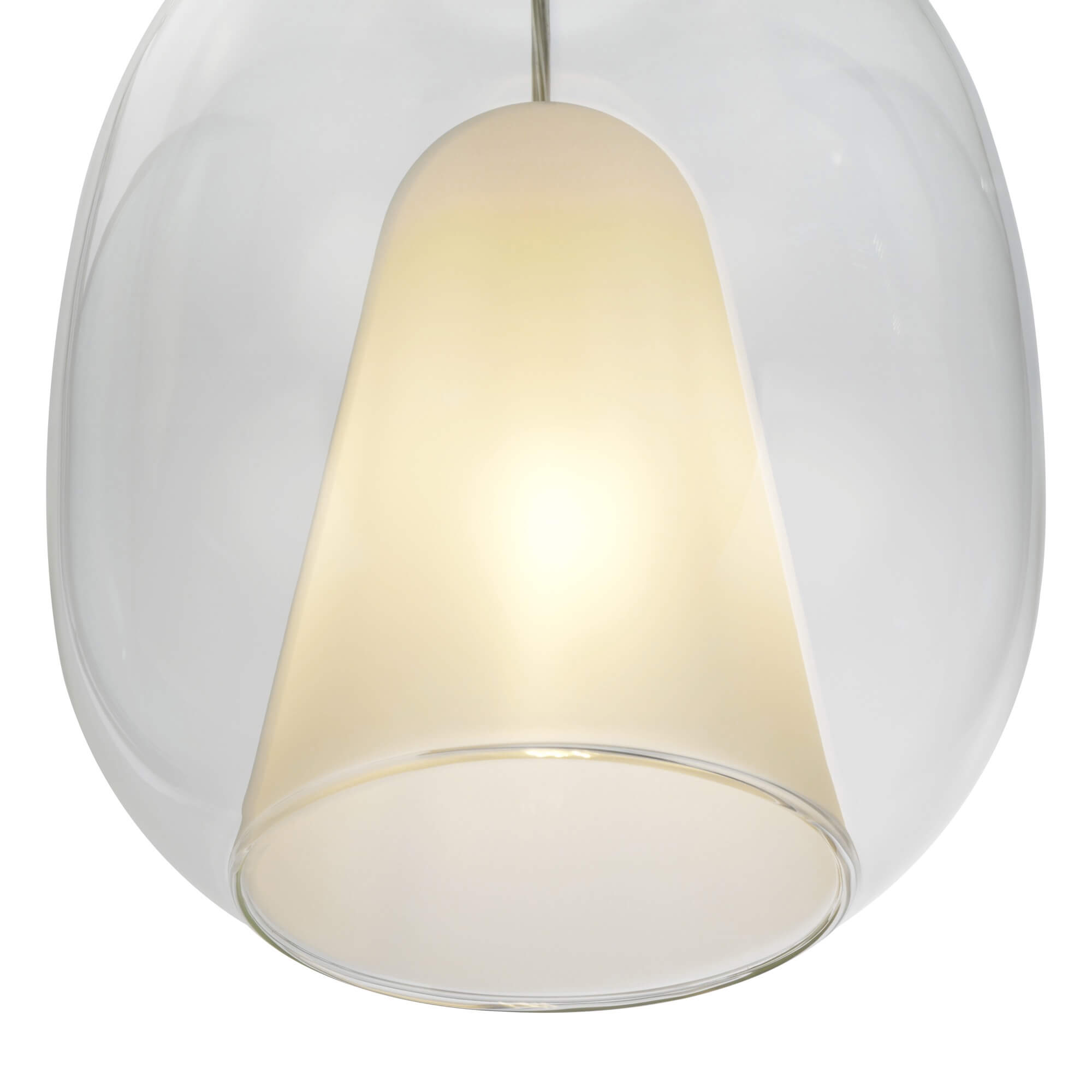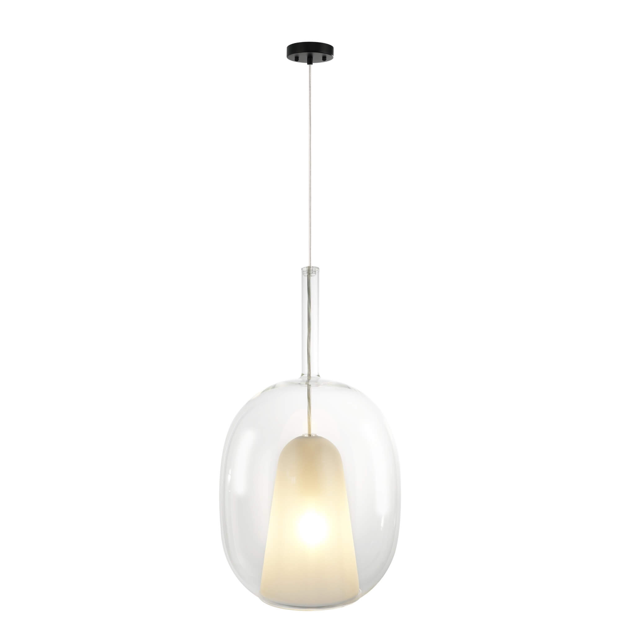 The Dusk Collection features this striking dual-glass single pendant that creates a sophisticated, layered lighting effect. At its core, an inner white cone-shaped glass shade provides soft, diffused illumination for a warm atmosphere. This centerpiece is elegantly encased within a larger clear glass outer shell, offering a clean and minimalist aesthetic that highlights the fixture's internal geometry. The design is completed with a sleek black canopy and cord, making it an ideal contemporary accent for any modern living space.