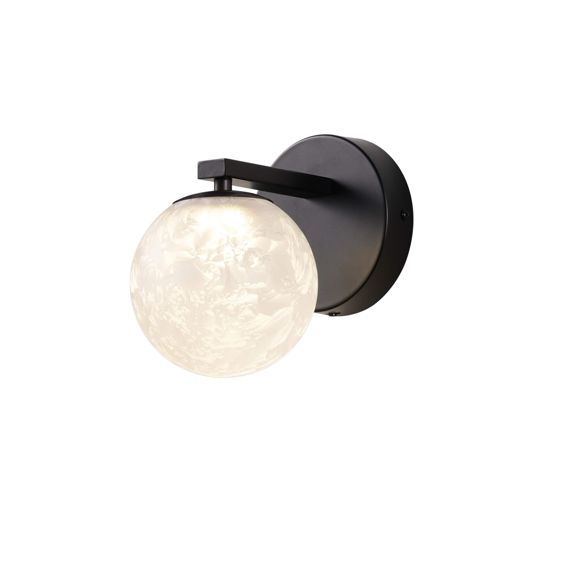 The Forma collection features this elegant LED wall sconce, showcasing a stunning globe of "Ice Glassware" that provides a brilliant, crystalline glow. This artisanal glass is beautifully supported by a modern bold black frame, offering a clean and sophisticated aesthetic for any interior. For ultimate versatility, this model is 3CCT enabled, allowing you to select the perfect color temperature to suit the mood of your home. Its sleek and durable design makes it an ideal lighting solution that can be used in bathrooms and hallways alike.