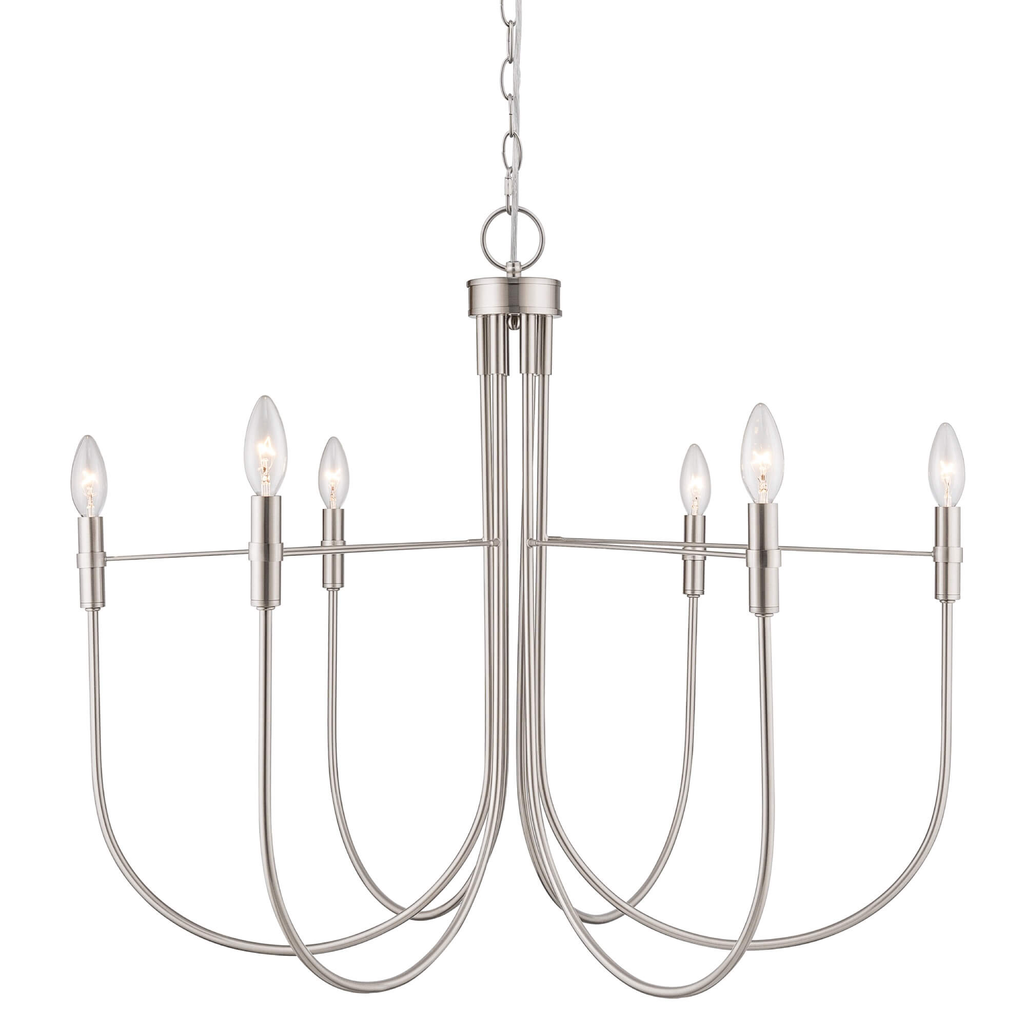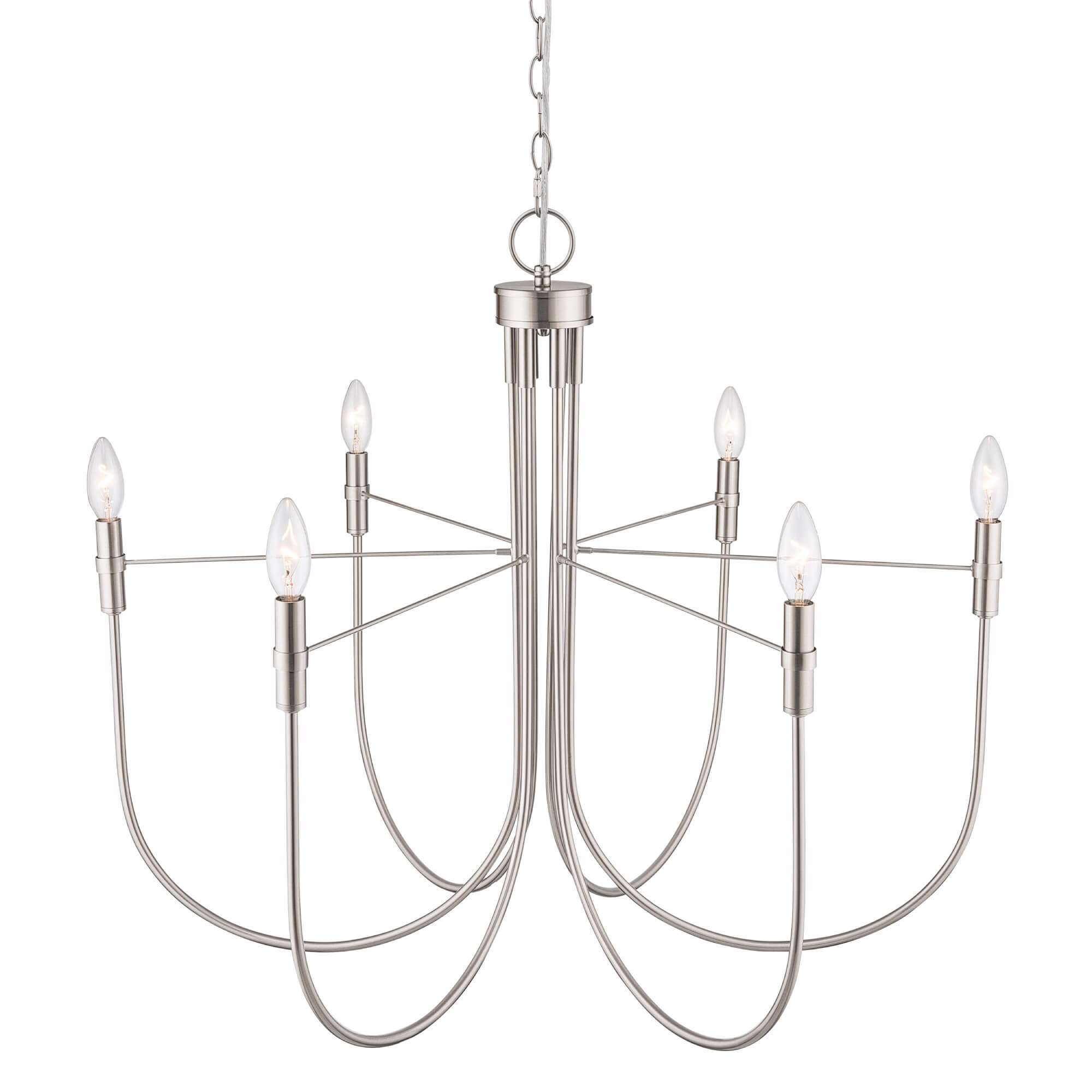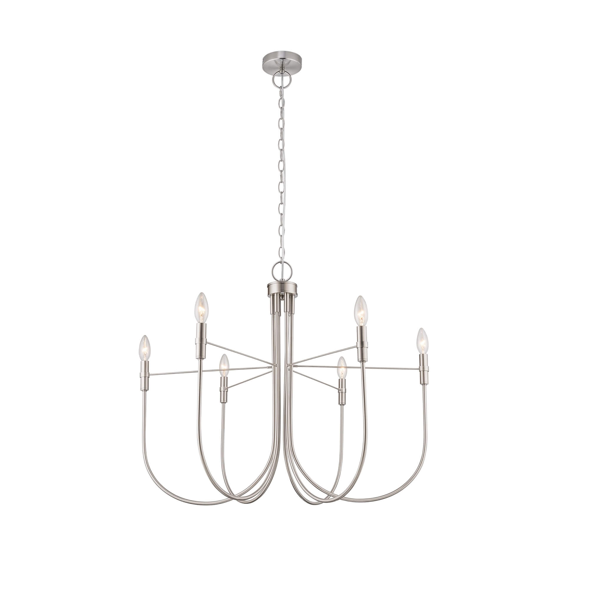 Designed by Kevin Kraemer for the Foundry Collection, this six-light chandelier features a monochromatic aesthetic finished in sleek plated brushed nickel. The fixture is defined by its elegant, sweeping arms that curve upward to support upright candelabra bulbs, creating a refined architectural silhouette. Its open-frame design and metallic luster offer a clean, contemporary look that provides bright, multidirectional illumination for modern living or dining spaces.
