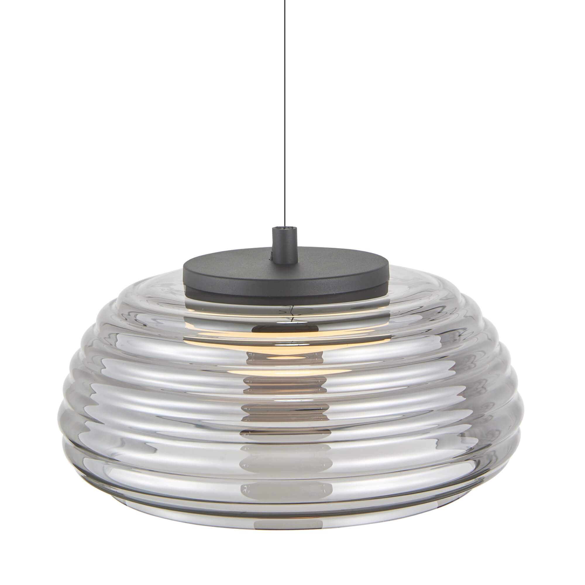 The Haze Collection presents this striking LED 16" pendant, featuring a wide-profile shade with distinct large ribbing on the smoke glassware. This glass design beautifully catches the light, creating a rhythmic and sophisticated visual effect across its surface. The fixture is anchored by a minimalist black frame and matching canopy, providing a clean, contemporary contrast to the bold glasswork. Perfect for over and island in a kitchen area. (Smaller size available)