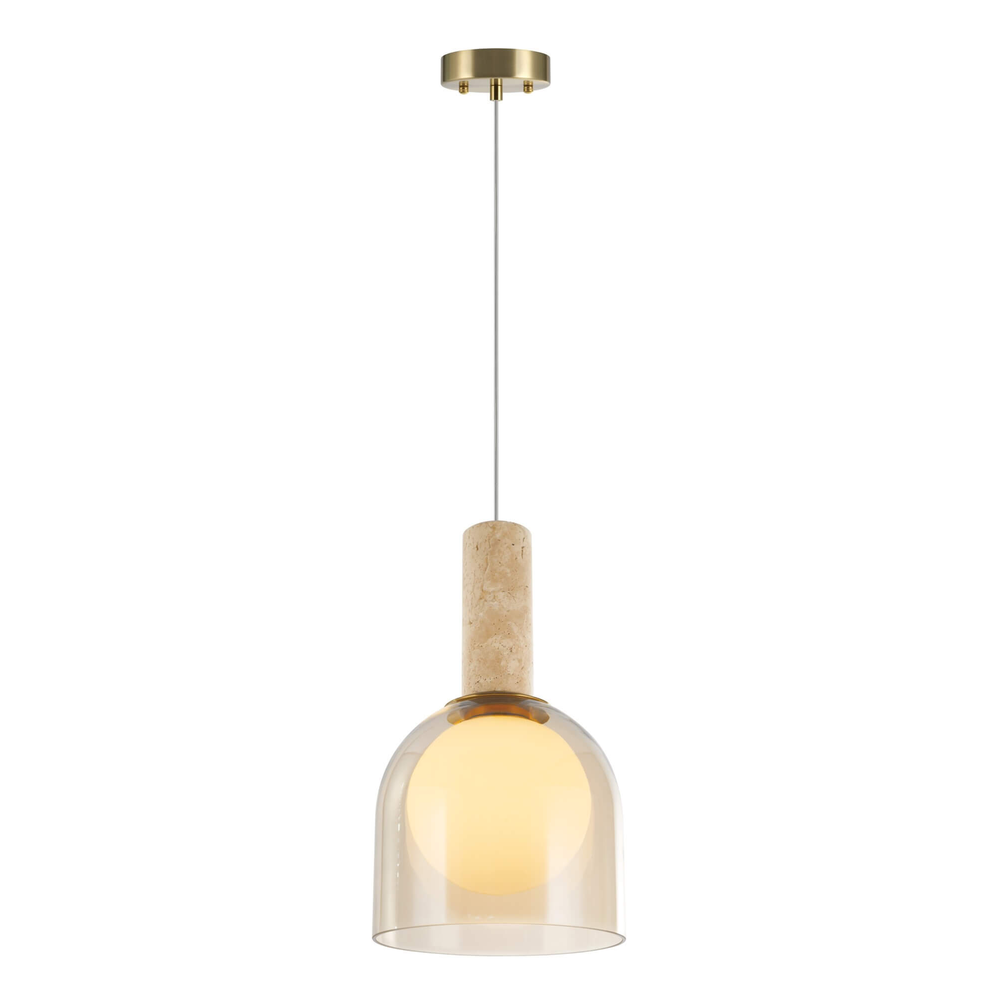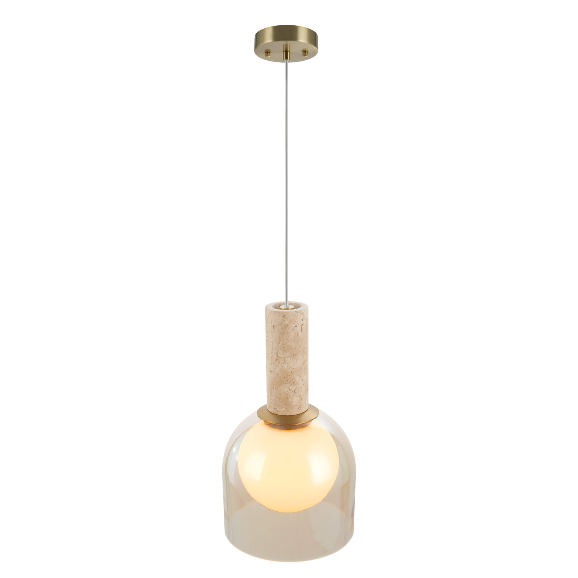 Part of the Juna collection by designer Steven Sabados of S&C, this sophisticated single pendant features a column of natural travertine that provides a rich, organic texture. The fixture's plated brass metalwork adds a warm, refined touch that beautifully complements the stone elements. At its core, a white inner glass globe is elegantly encased within a tea stain outer glass shade, creating a soft and multi-dimensional lighting effect. This design thoughtfully blends diverse materials and warm tones to serve as a luxurious focal point in any modern interior.