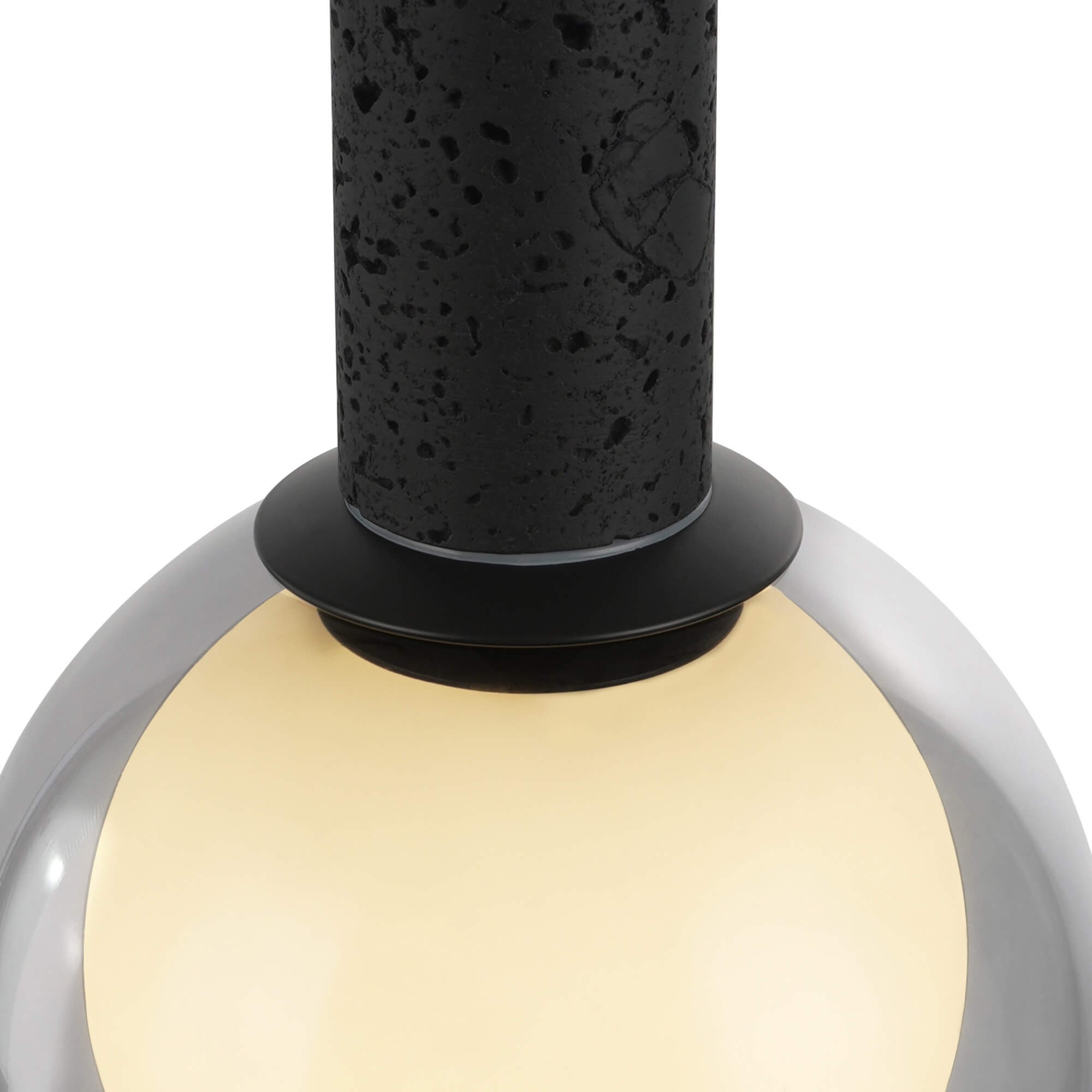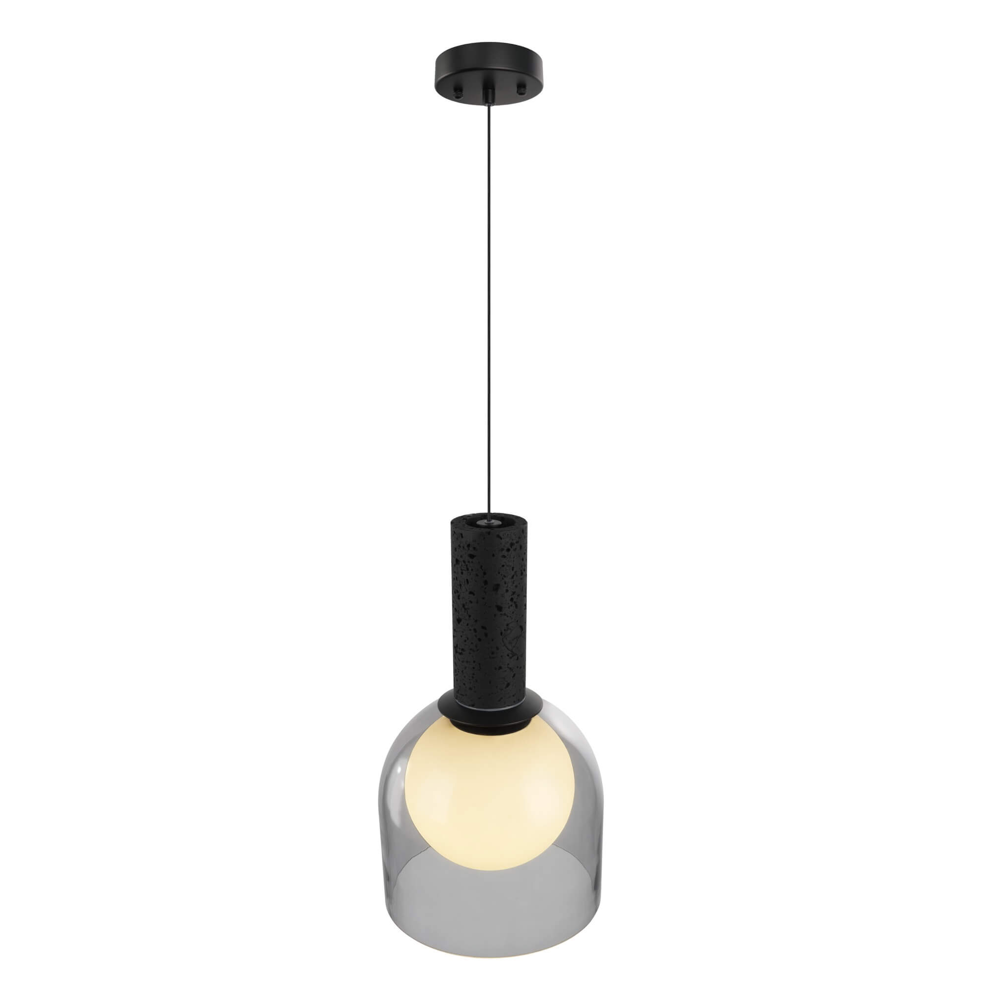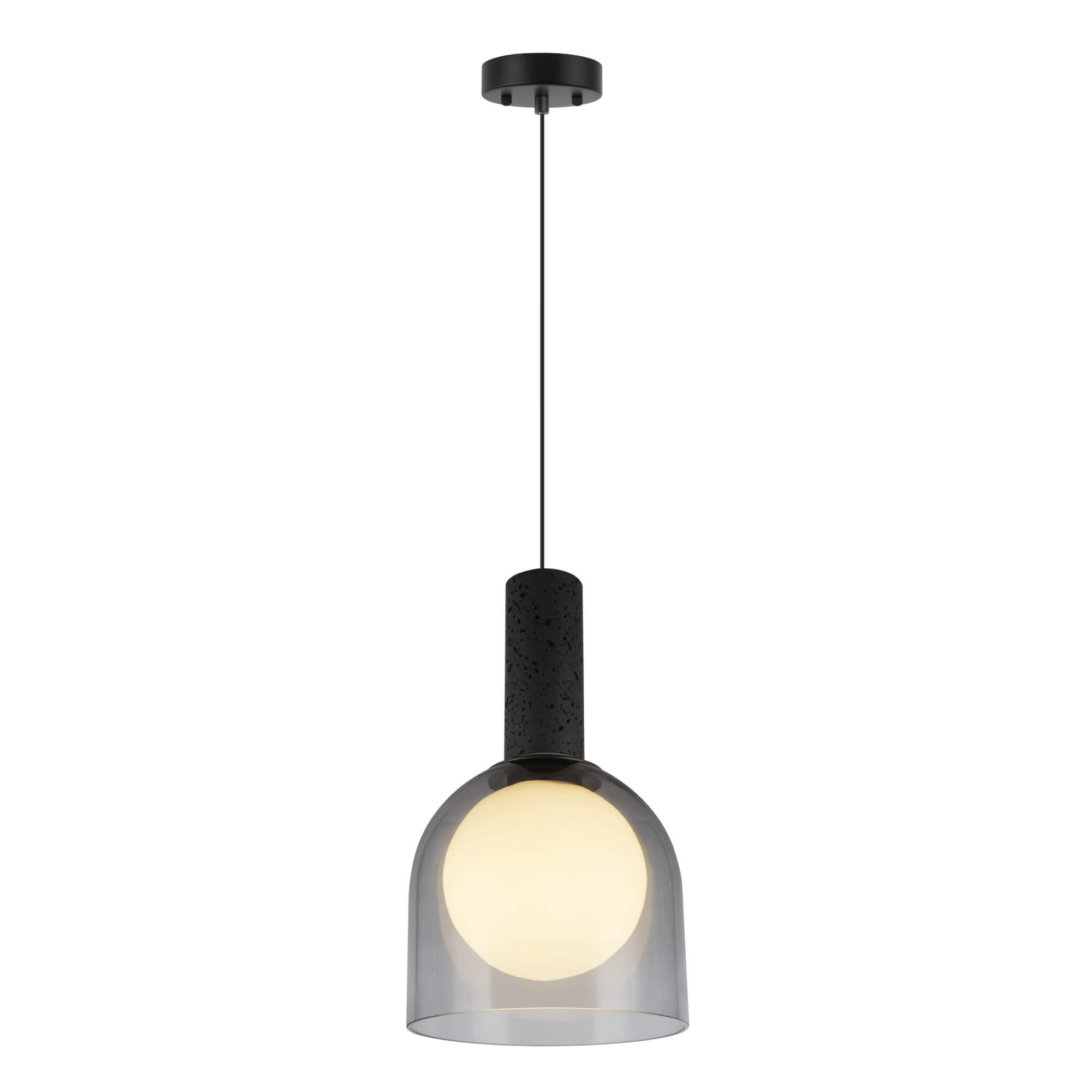 Part of the Juna collection by designer Steven Sabados of S&C, this sophisticated single pendant features a column of natural travertine finished in a bold, tactile black. The fixture is anchored by sleek black metalwork, providing a cohesive and modern monochromatic aesthetic. At its core, a white inner glass globe is elegantly encased within a smoke outer glass shade, creating a layered and moody lighting effect. This design masterfully blends raw stone textures with refined glass elements to serve as a luxurious contemporary focal point.