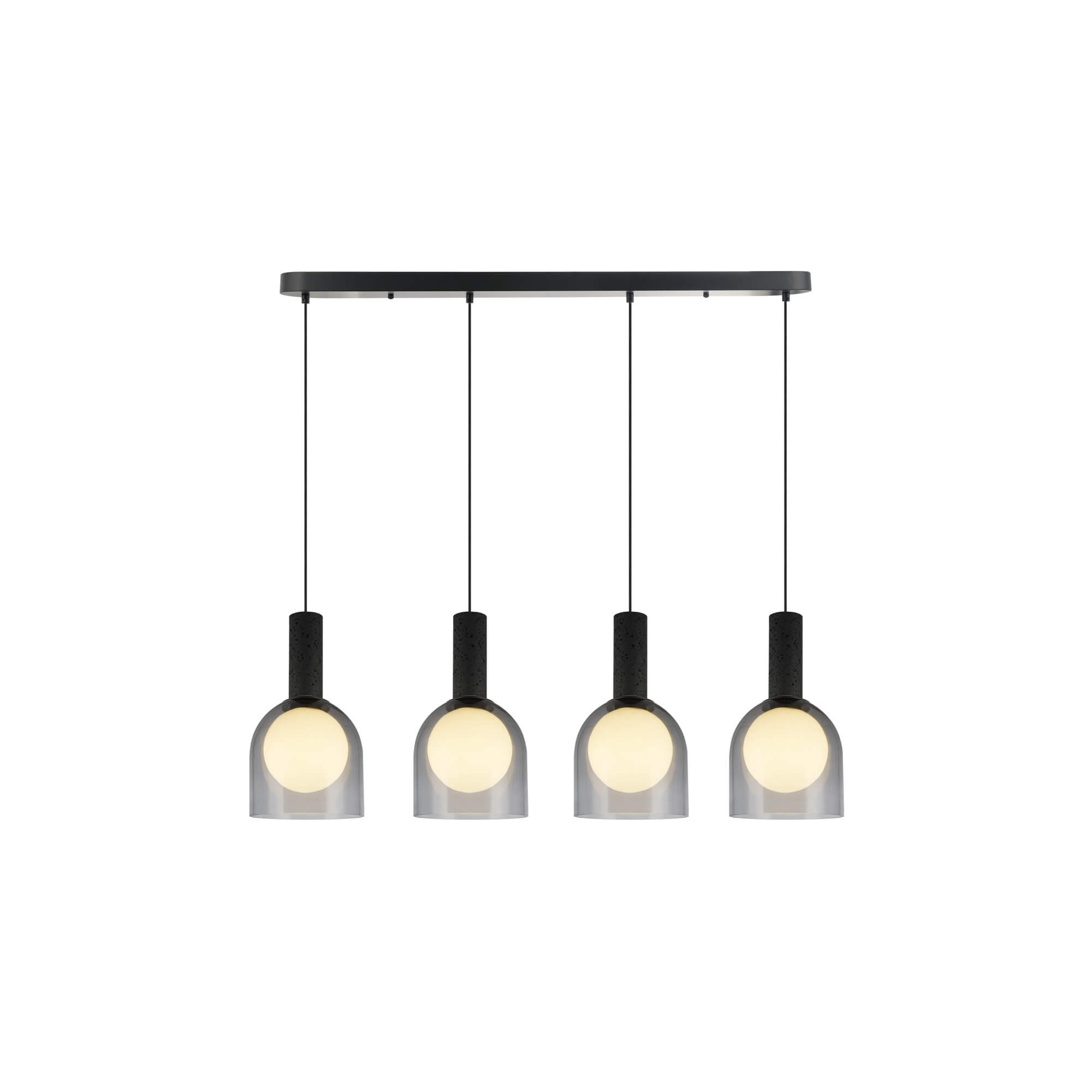 Part of the Juna collection by designer Steven Sabados of S&C, this sophisticated four-light linear island chandelier features columns of natural travertine finished in a bold, tactile black. The fixture is anchored by a sleek black linear canopy and matching hardware, providing a cohesive and modern monochromatic aesthetic. At the heart of each pendant, a white inner glass globe is elegantly encased within a smoke outer glass shade, creating a layered and moody lighting effect. This design masterfully blends raw stone textures with refined glass elements to serve as a luxurious contemporary focal point for a kitchen island or dining table.