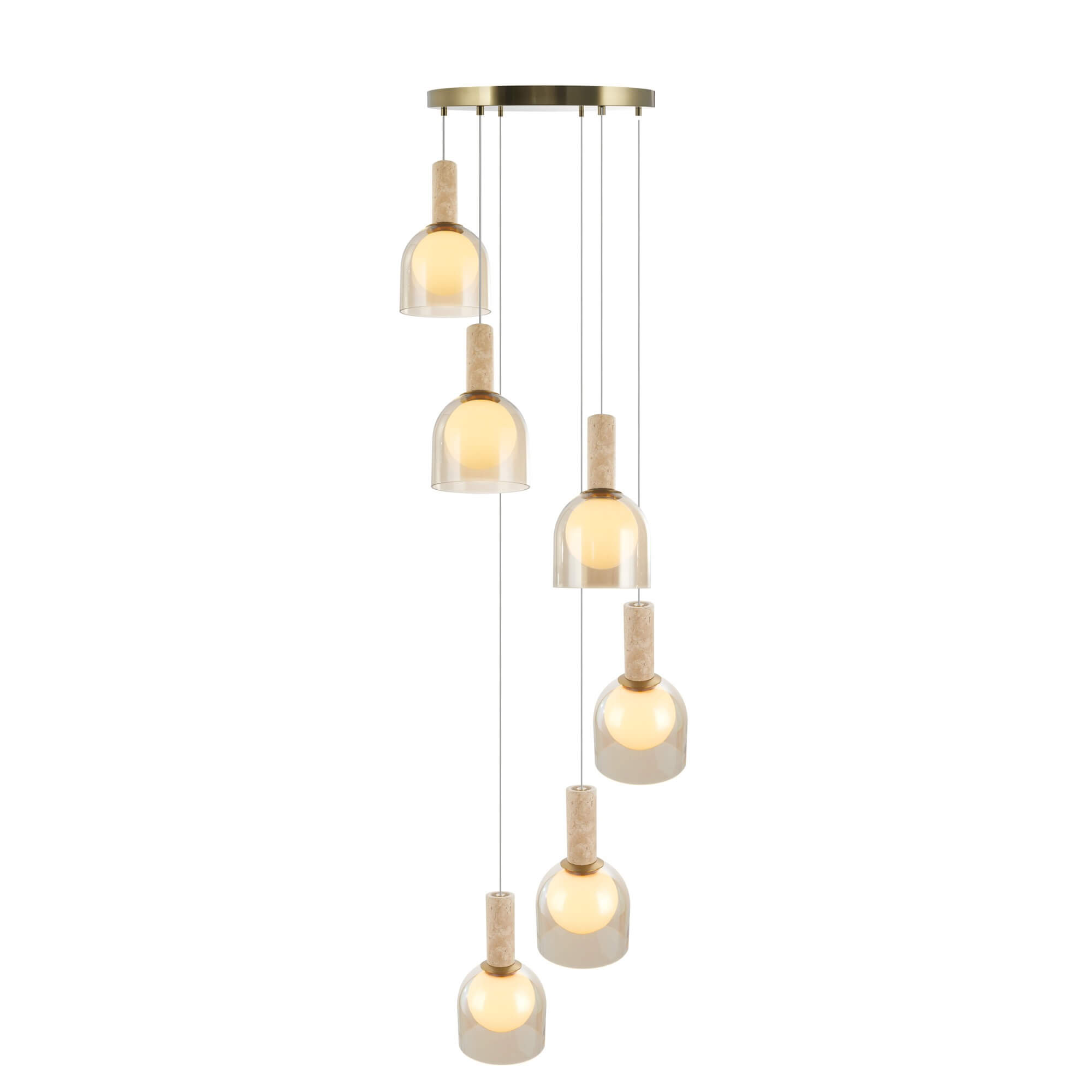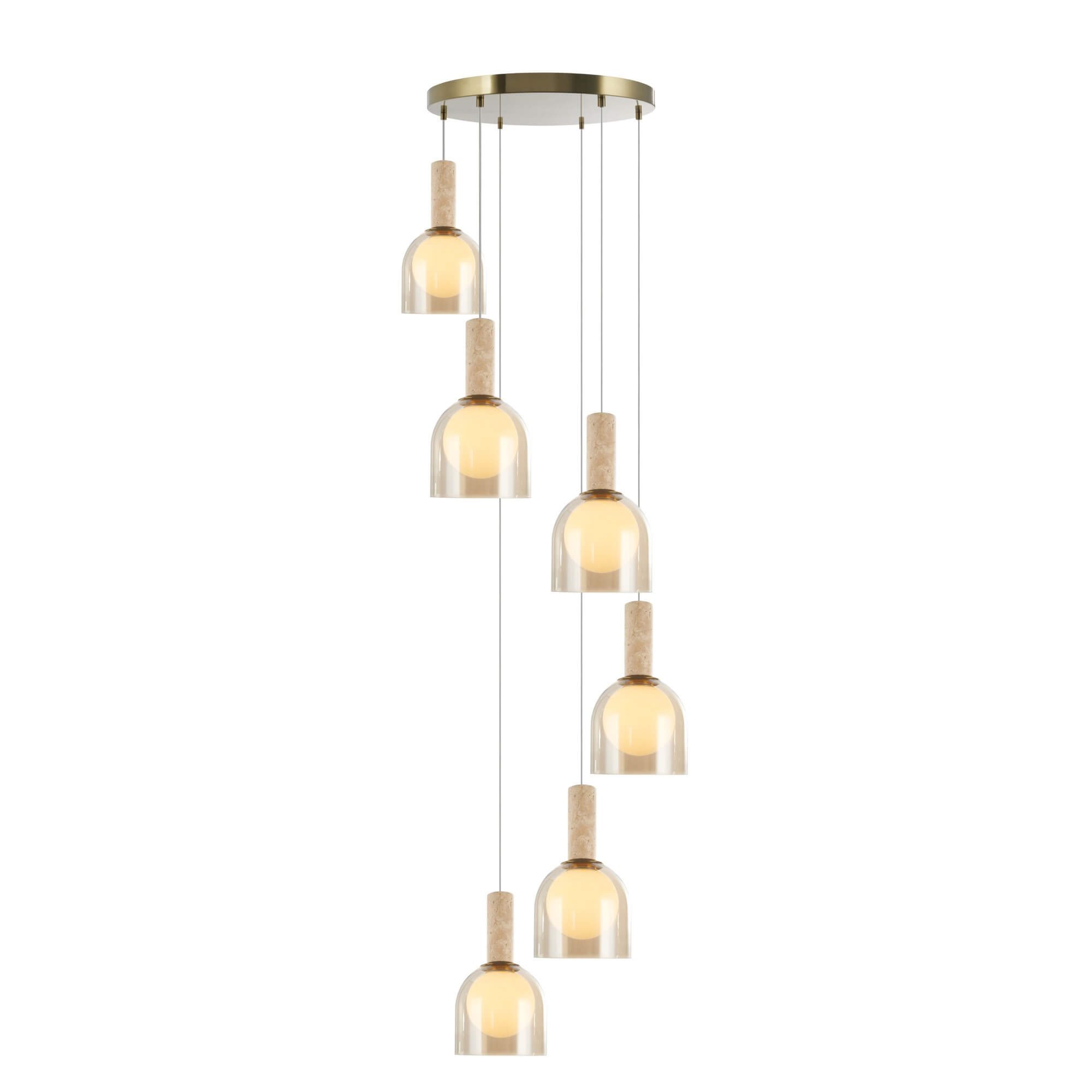 Designed by Steven Sabados of S&C, this grand 6-light foyer chandelier from the Juna collection creates a dramatic vertical statement with its cascading arrangement of pendants. Each light features a natural travertine column, beautifully merging raw organic texture with a sophisticated aesthetic. The fixture is unified by a circular plated brass canopy and matching hardware, while the white inner glass globes are encased in tea stain outer glass to provide layered, warm illumination. This sophisticated piece is ideal for entryways, offering a luxurious contemporary focal point that blends high-end materials with artistic form.