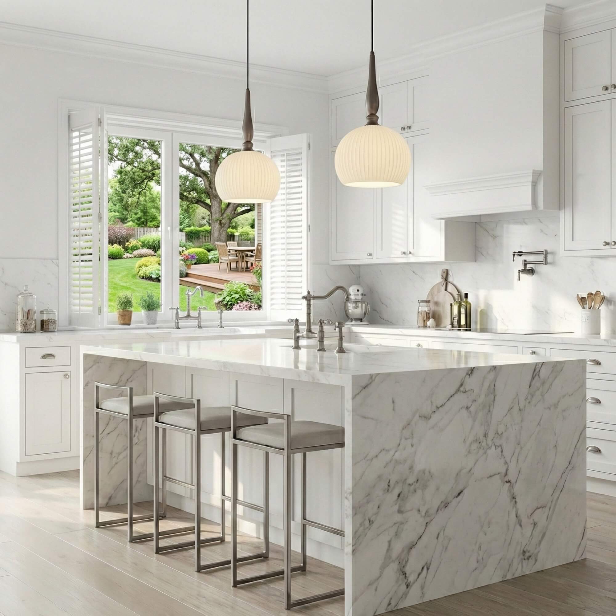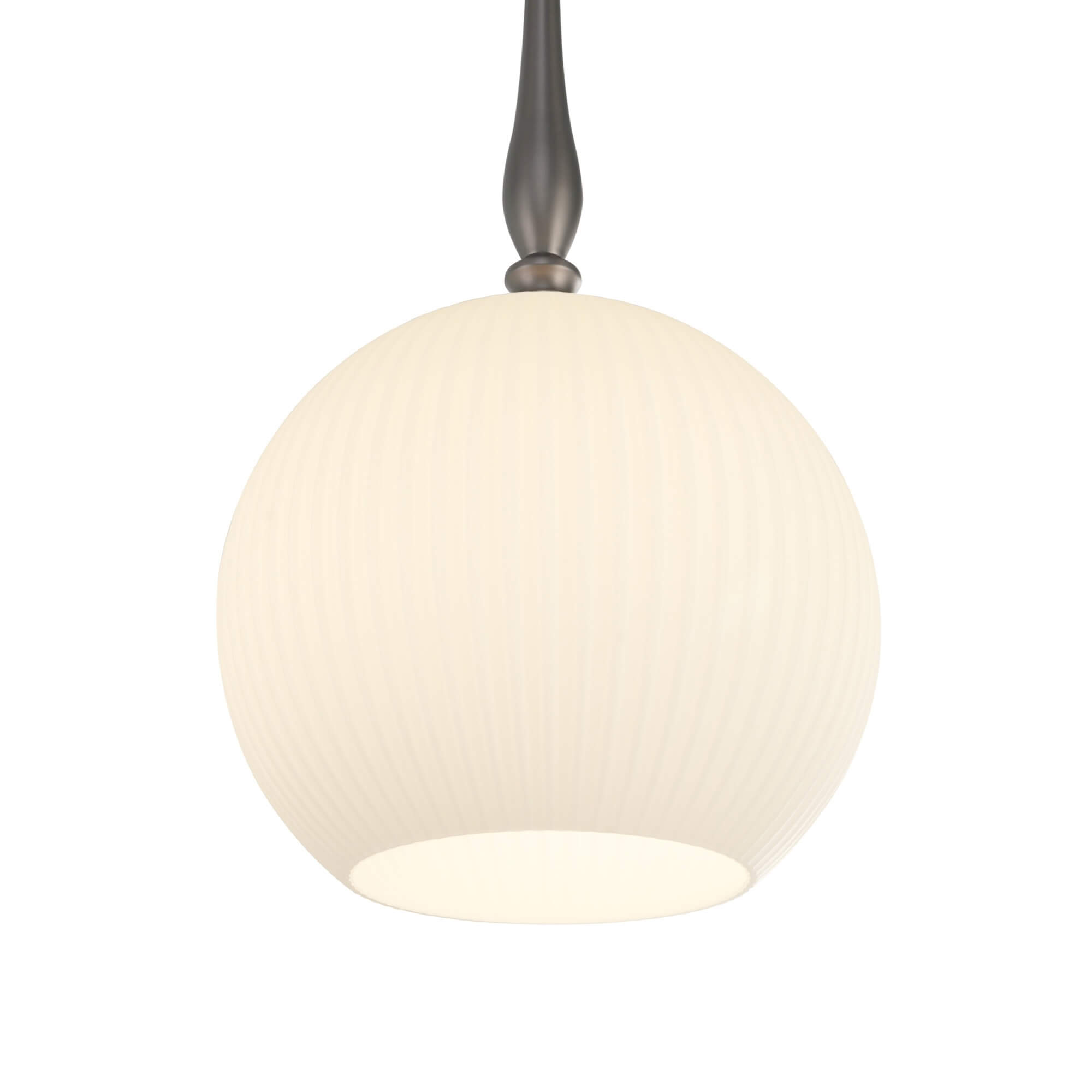 The Kate Collection pendant features a sophisticated, plated graphite column that tapers gracefully into a decorative, shapely finial. Its focal point is a ribbed opal glass shade, which provides a soft, diffused glow and a touch of mid-century modern texture. The minimalist design is suspended by a slender black cord, maintaining a sleek and airy silhouette suitable for contemporary spaces.