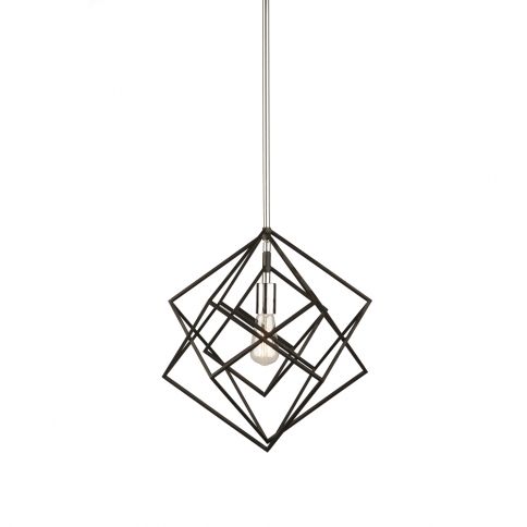 Stunning in design, this two tone multiple square pendant from the "Artistry" collection is an instant classic. The interior has a polished nickel frame, while the exterior frame is a matte black finish. Multiple rods included with hangstraight for sloped ceilings. (Also available in black with harvest brown)
