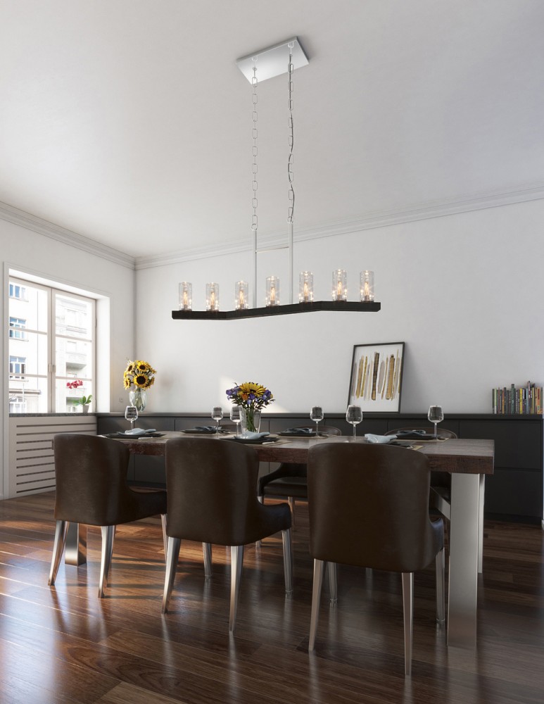 Made in North America with pride, the "Canyon Creek" collection is made of authentic wood (pine) and has high quality chrome plated metal work complimented with clear glassware. Shown in dark brown finish (also available in natural organic wood finish)