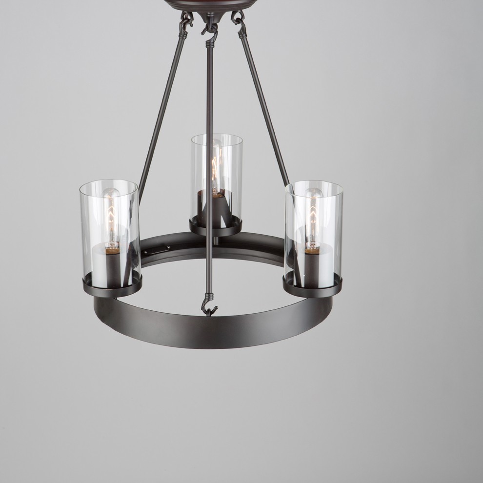 The Menlo Park Collection is painted in a dark chocolate finish, and complimented with a clear cylinder glass. Spherical clean lines throughout gives this collection the status of an instant classic. Shown with Edison filament bulbs to convey the retro look. Tri light mini chandelier