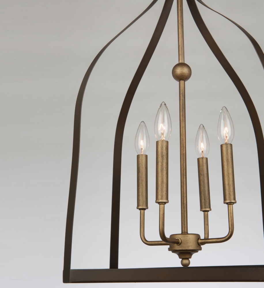 The 4 lite large size cage, from the "Worthington" collection features a two tone styling. The inner frame, rods, and canopy are antique gold and the outer cage is oil rubbed bronze. Illuminated by candelabra bulbs. Comes with a hang straight for sloped ceilings, and extra rods for easy height adjustment.