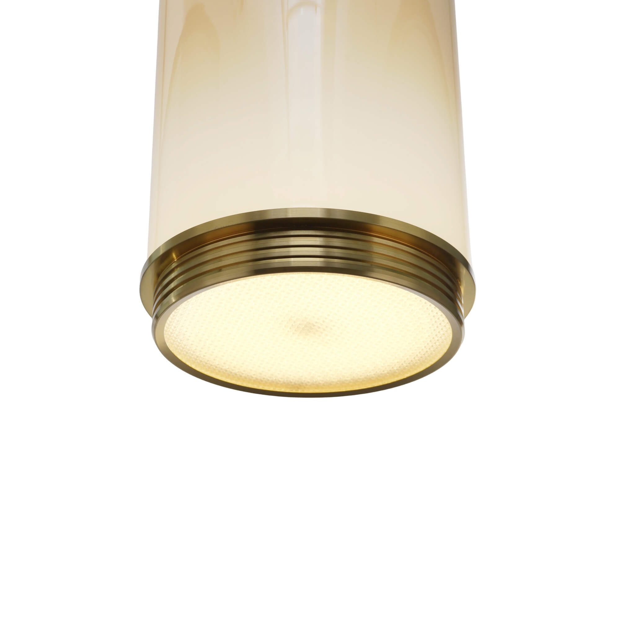 The Nebulosa Collection pendant features a striking elongated glass shade that showcases a seamless amber to white ombre transition. This elegant glasswork is complemented by sophisticated brass metalwork, including a detailed circular base and matching ceiling canopy. The fixture is efficiently LED lit, providing an integrated light source that glows beautifully through the frosted white and warm amber tones. Its clean, cylindrical silhouette and minimalist suspension cord make it a versatile statement piece for modern interiors.
