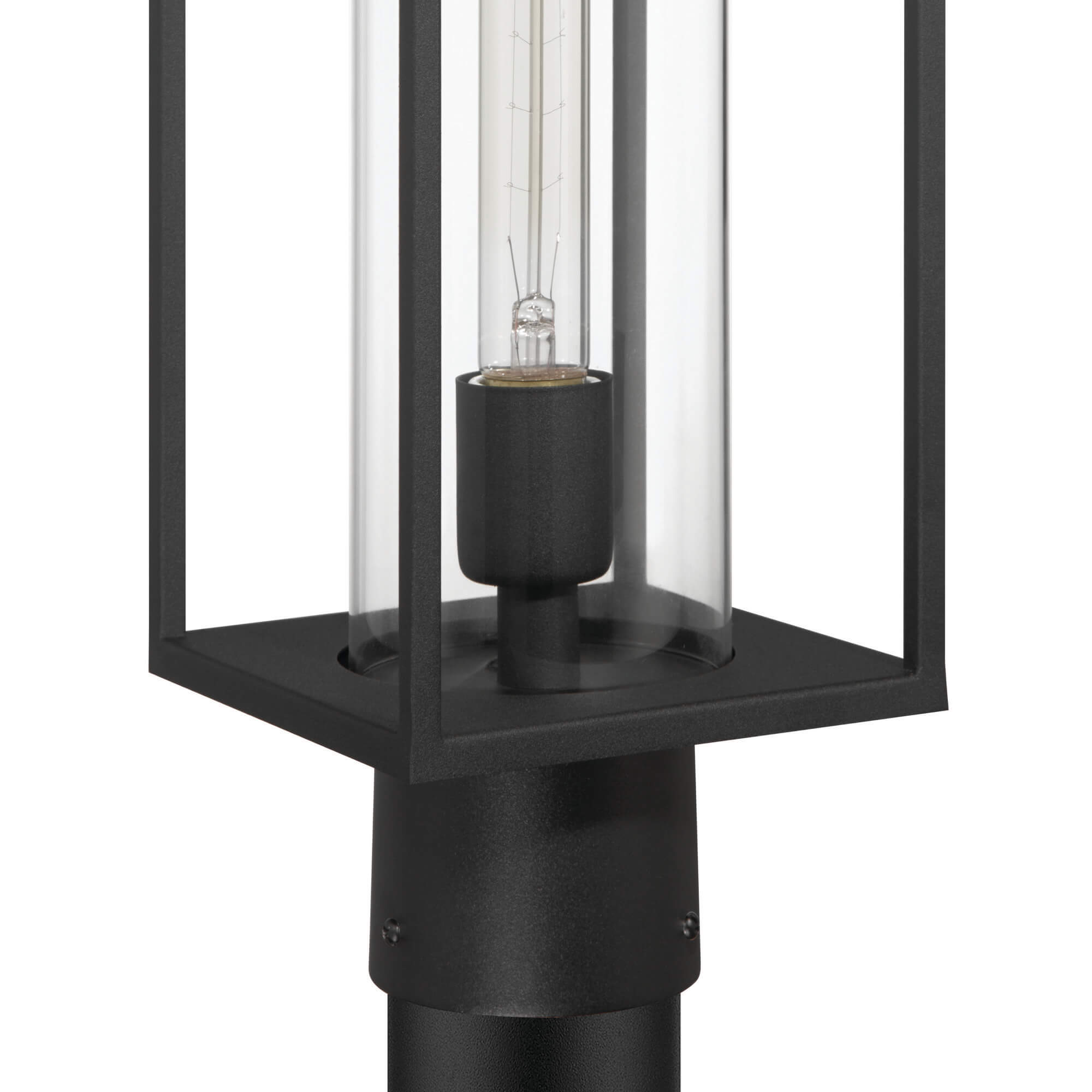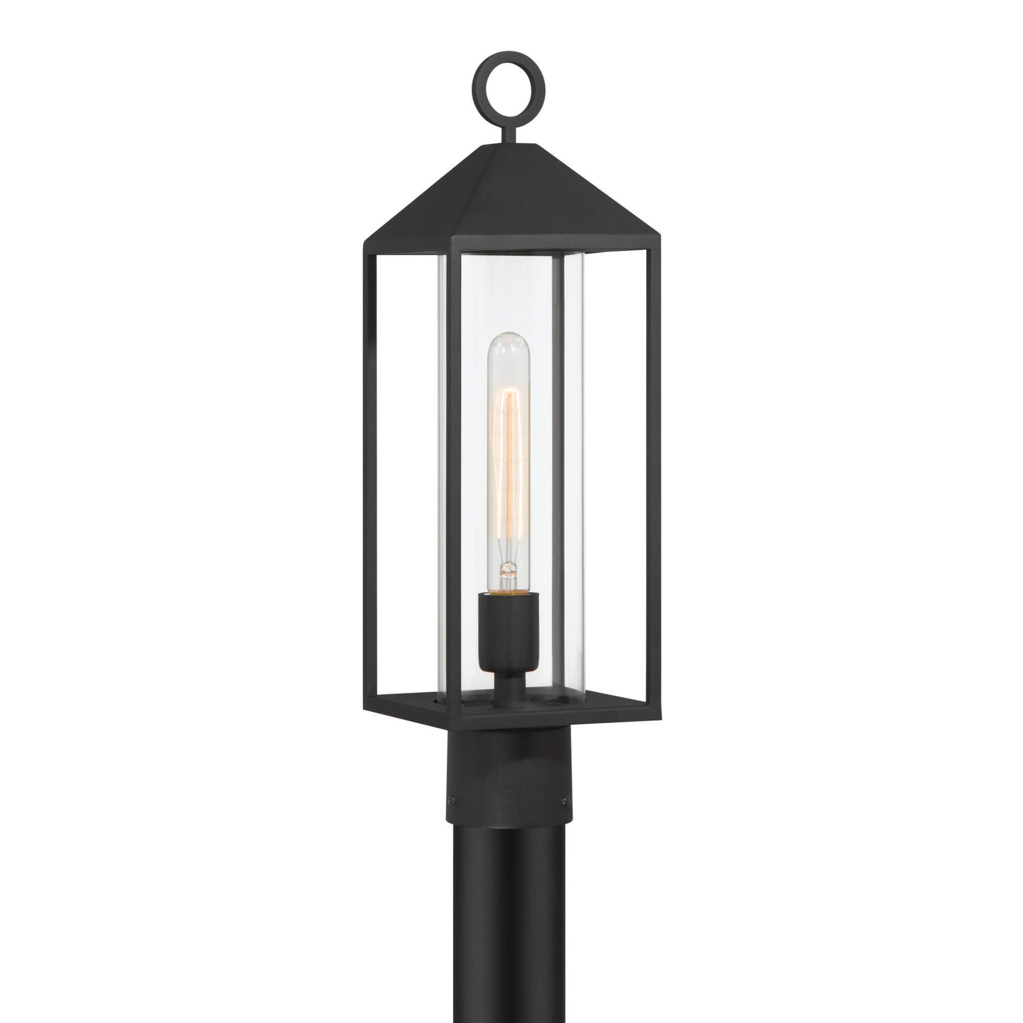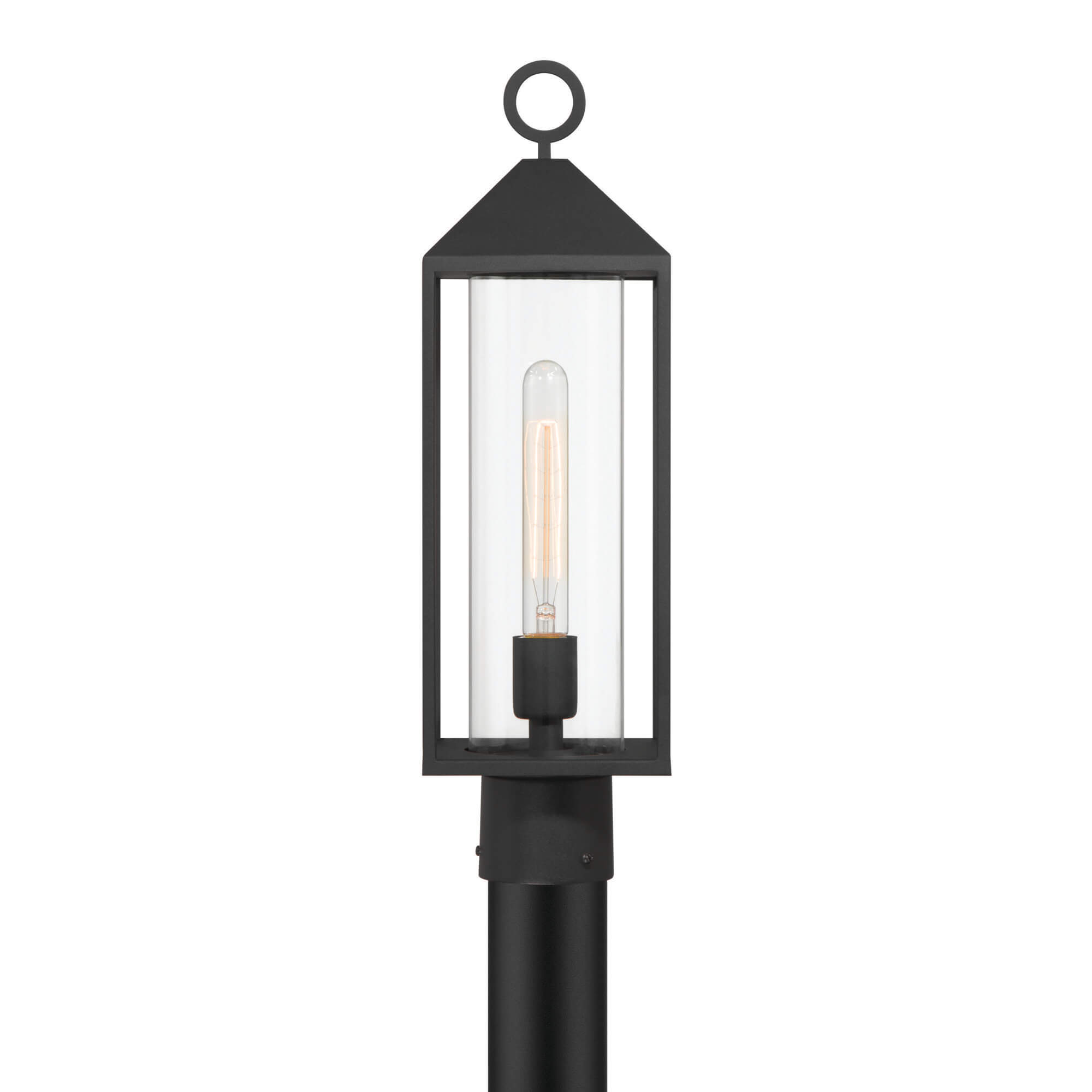 Designed by Kevin Kraemer, this outdoor single head post from the Portside collection features a sleek and architectural silhouette. The fixture is finished in a bold matte black, providing a clean, contemporary look that enhances any property's exterior. At its center, a circular interior clear glass column elegantly encases the light source, offering bright and unobstructed illumination for pathways or driveways. This sophisticated combination of a minimalist frame and refined glasswork makes it a durable and stylish statement piece for modern outdoor landscapes.