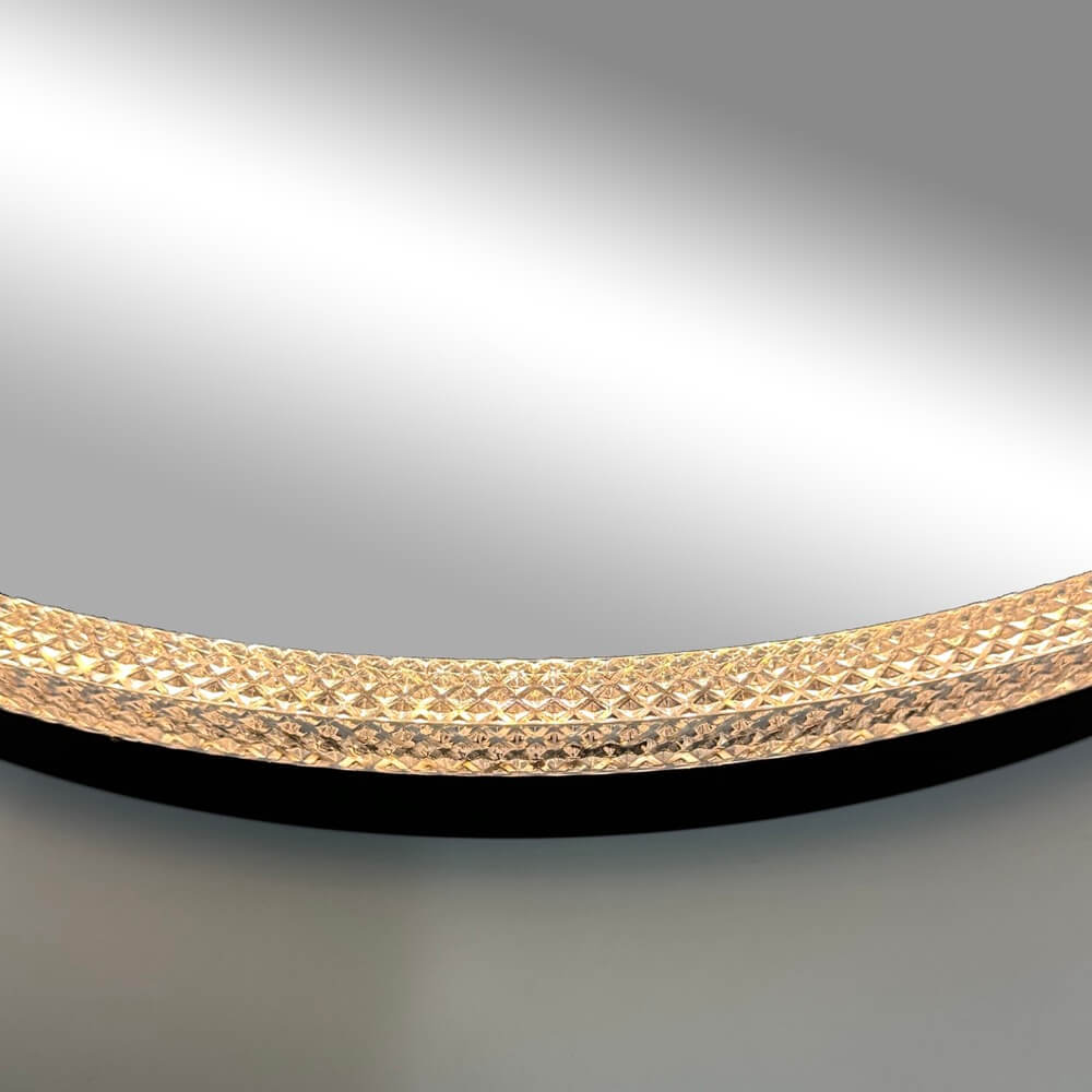 The "Reflection Collection" model shown is circular in design, and has a crystalline trim with a black back frame. It has a built in "Smart Touch" dimmer switch to control the brightness of the LEDs. The switch allows the user to control the brightness or turn the light on/off. (Also ADA compliant)