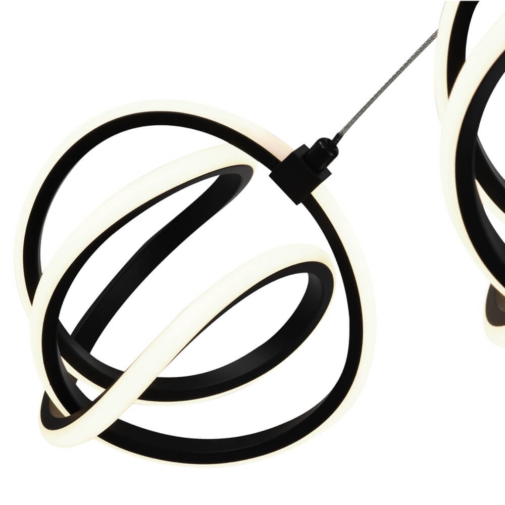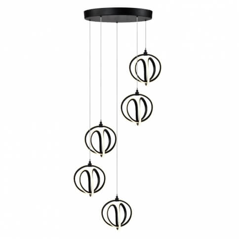The Rose Collection 5 light foyer chandelier features uniquely shaped circular pendants which are illuminated by energy efficient LED. The framing and canopy are comprised of a rich black finish. The light is held by a height adjustable thin aircraft type cable.