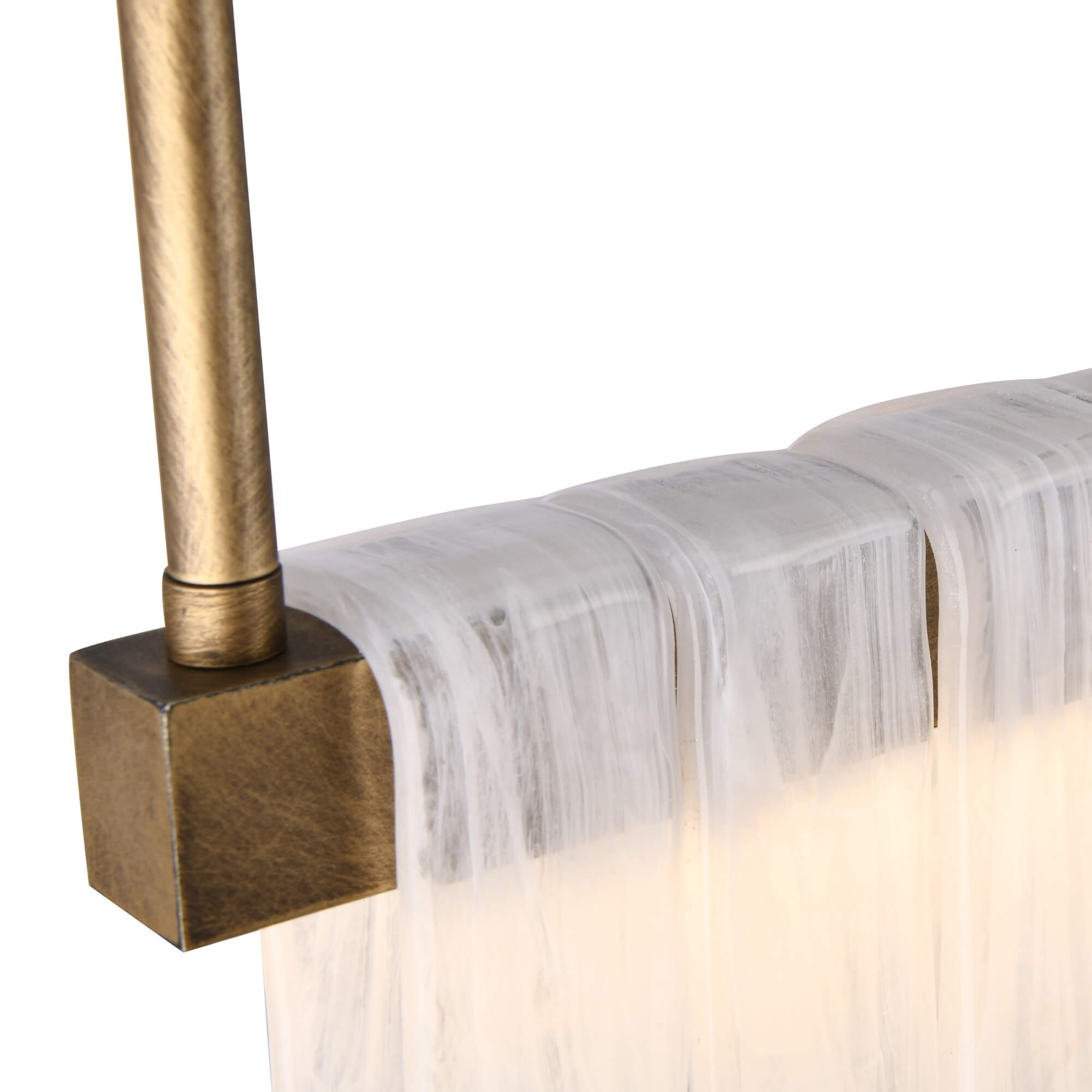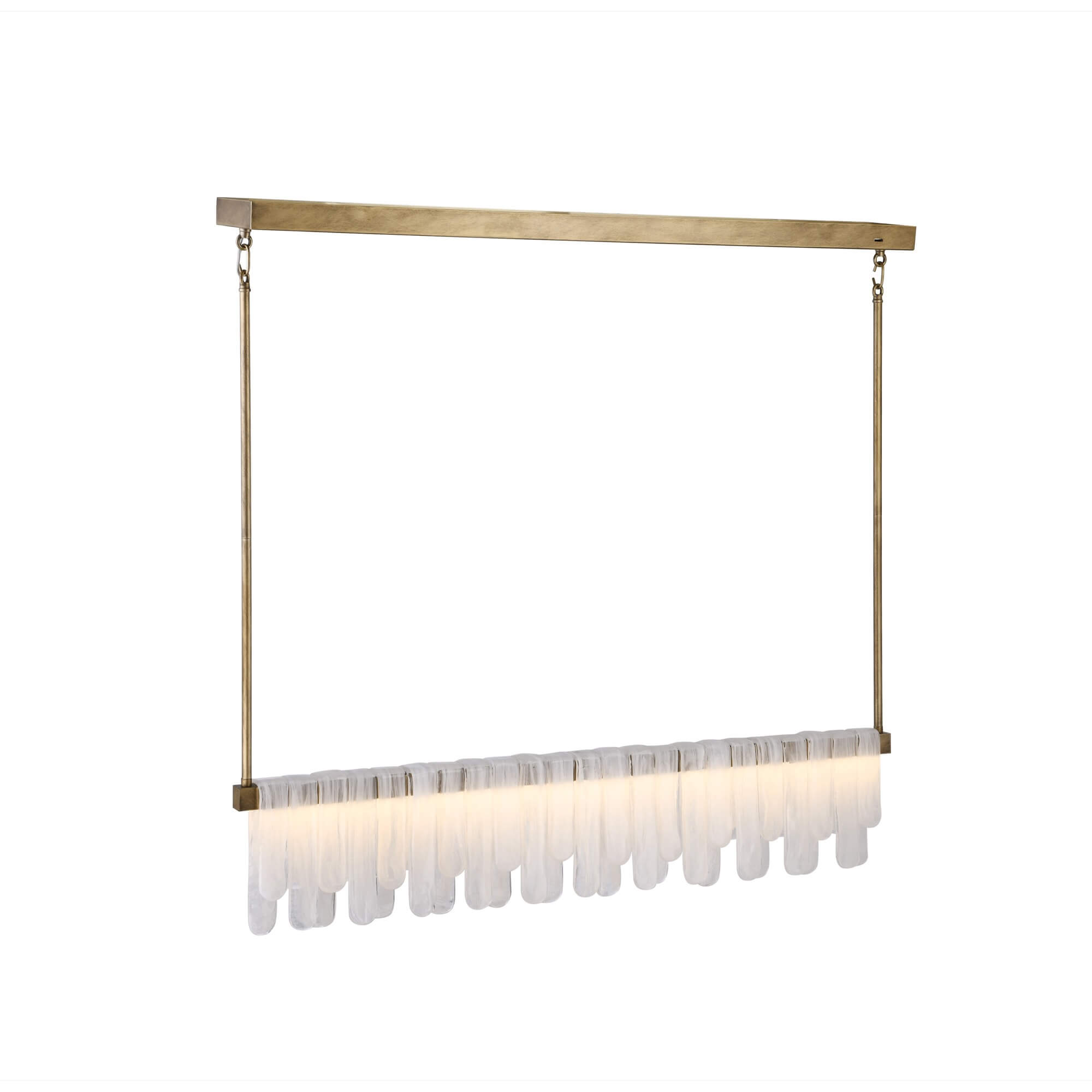 Designed by Sarah Baeumler, this striking linear island chandelier from the Roselle Collection combines mid-century inspiration with modern organic textures. The sophisticated Legacy Brass frame is beautifully adorned with a continuous row of handcrafted "Piastra" glassware, which features a unique, frozen-in-time ripple effect. This artistic glass is expertly LED illuminated, casting a warm and inviting glow that highlights the intricate details of each individual plate. For ultimate flexibility, the fixture is 3CCT enabled, allowing you to select the perfect color temperature to complement your space. Great for a dining room or island area.