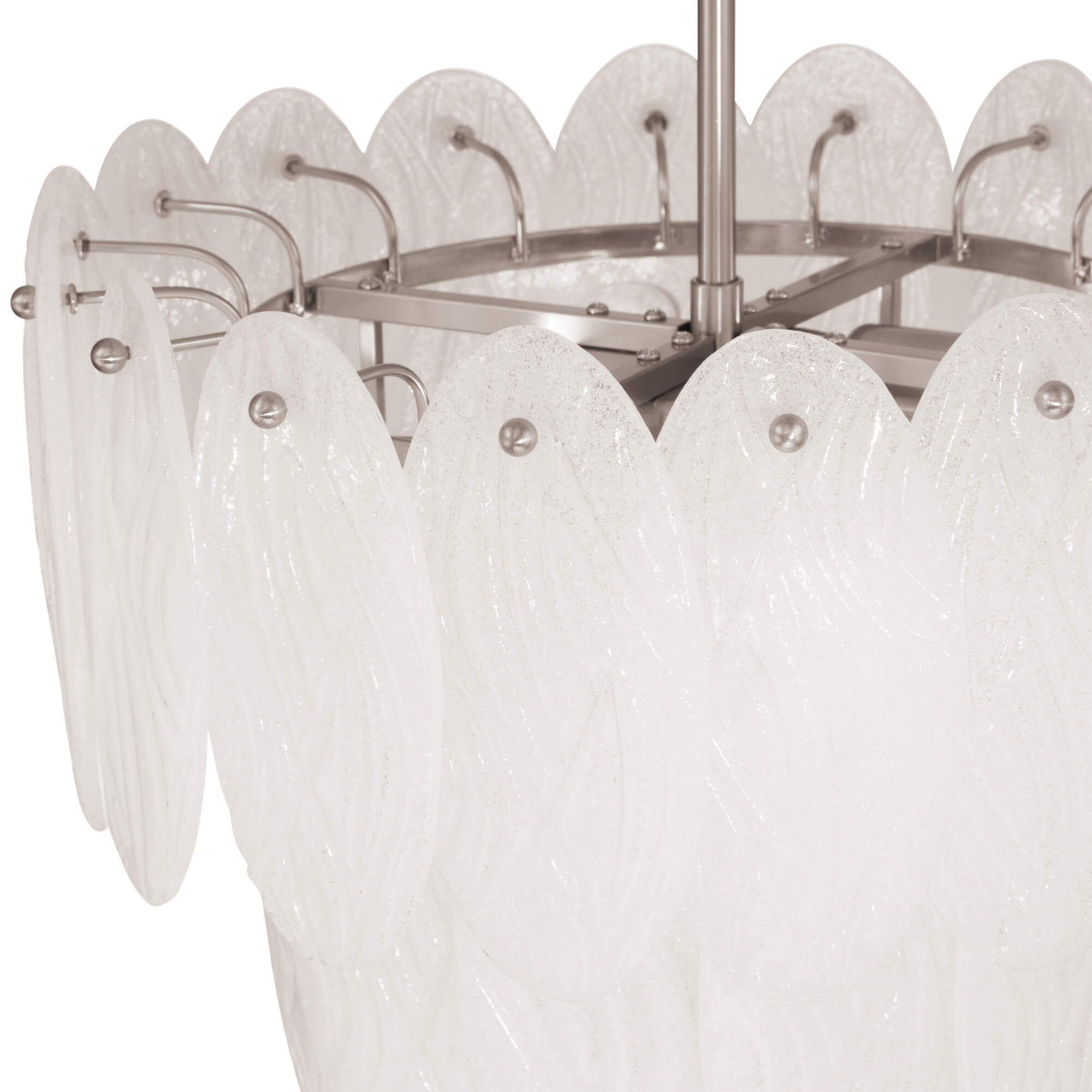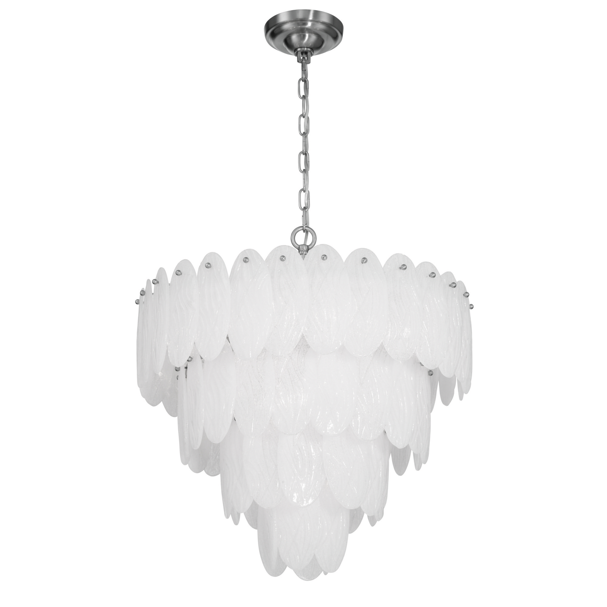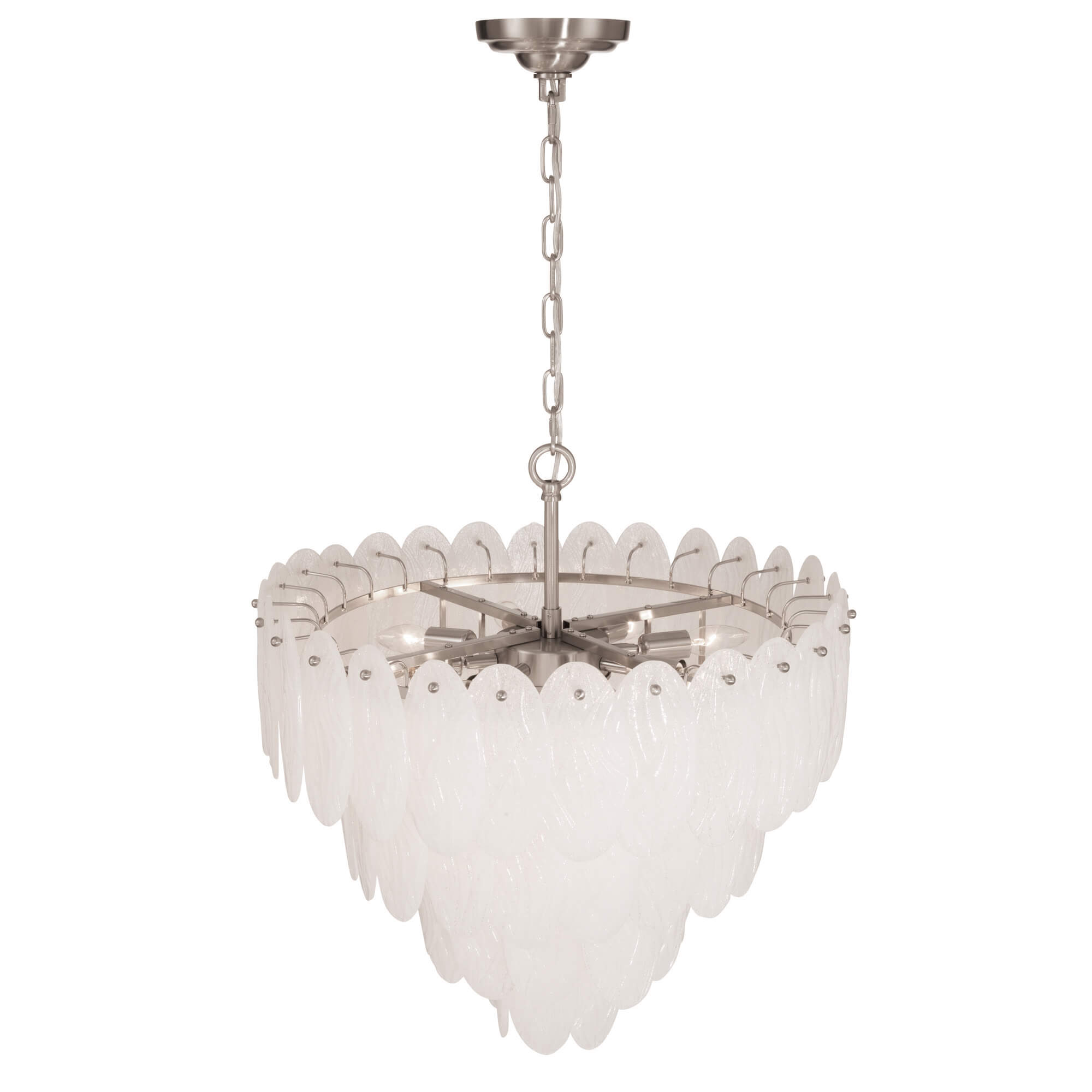 The Serena collection features this stunning 24" chandelier, which showcases a cascading arrangement of beautiful organic-style white sparkly etched pendalogue glass. The intricate glass elements are designed to capture and refract light, creating a dazzling and sophisticated atmosphere in any room. Supporting this elegant display is high-quality hardware plated in satin nickel, providing a clean and contemporary finish. This medium-sized fixture serves as a luxurious focal point, perfectly blending artistic textures with modern metallic tones. Great for a kitchen or dining room.
