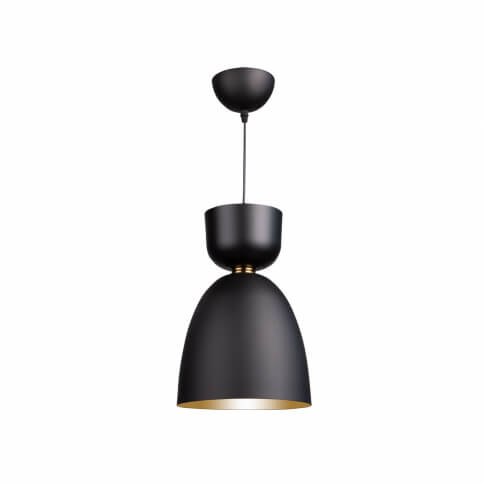 The "Tempo Collection" from designer Steven Sabados [S&C] gives a transitional to modern twist on single pendants. This fixture is a metal shade in black with a reflective gold on the interior. The mid section has a brass ring to add a little extra. The cord is height adjustable. There are 3 versions available in different shapes.