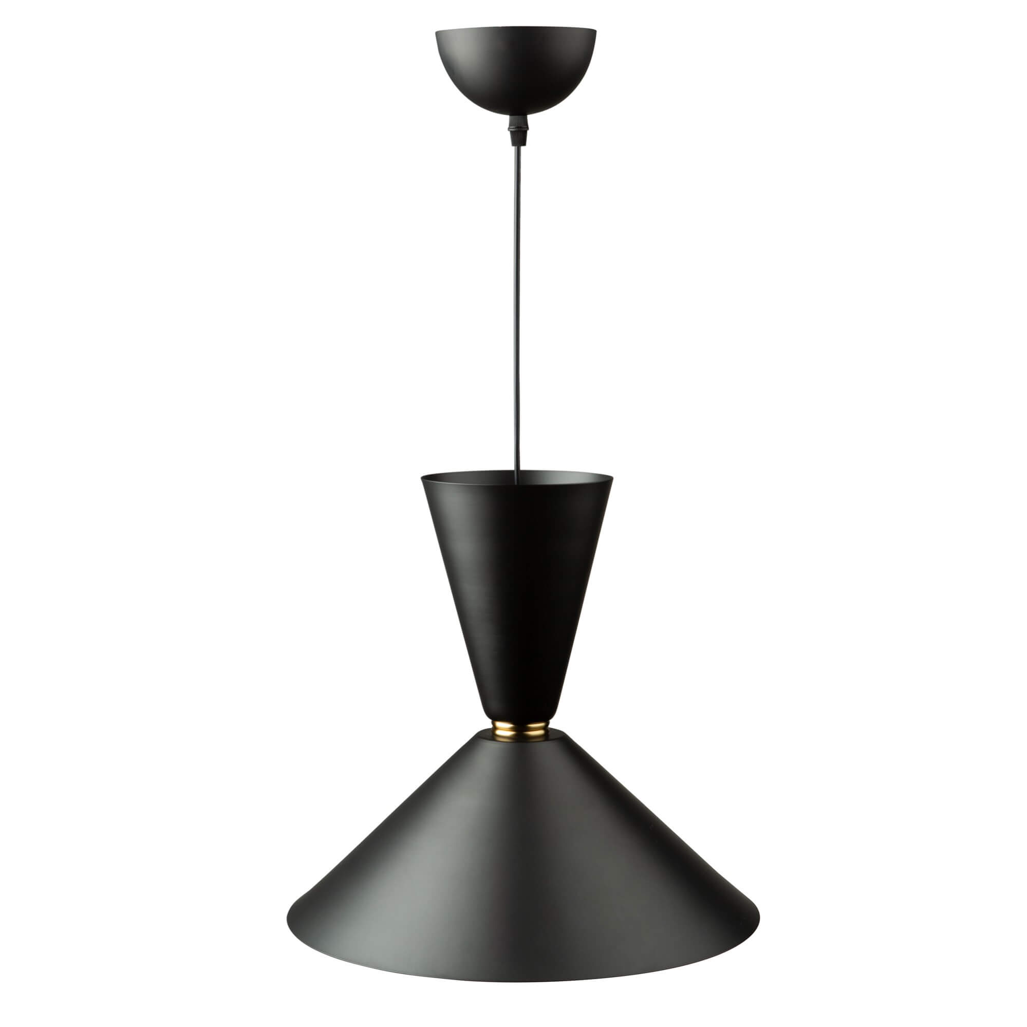 The "Tempo Collection" from designer Steven Sabados [S&C] gives a transitional to modern twist on single pendants. This fixture is a metal shade in black with a reflective gold on the interior. The mid section has a brass ring to add a little extra. The cord is height adjustable. There are 3 versions available in different shapes.