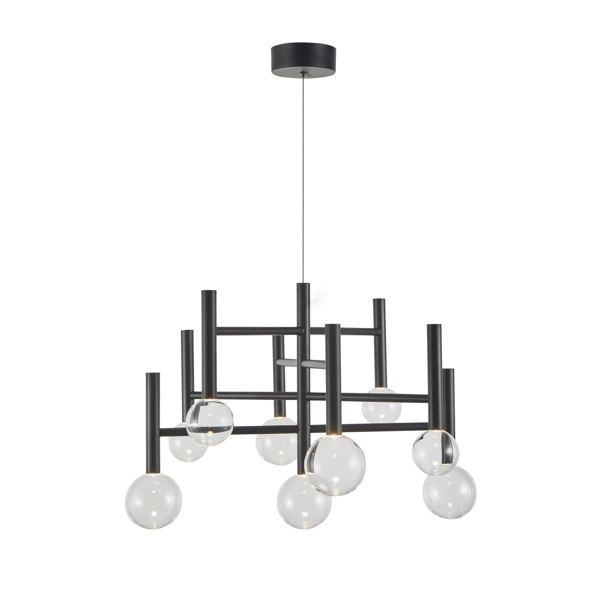 Designed by Steven Sabados of S&C, this striking LED chandelier is a featured piece from the Terra Collection. The fixture is defined by its architectural black frame, which supports nine elegant columns of varying heights for a dynamic visual effect. Each column is topped with sophisticated clear glassware that houses the integrated LED light source, providing a clean and modern glow. For added versatility, this model is 3CCT enabled, allowing you to customize the color temperature to perfectly complement your interior's ambiance. Great for a dinning room or kitchen table.