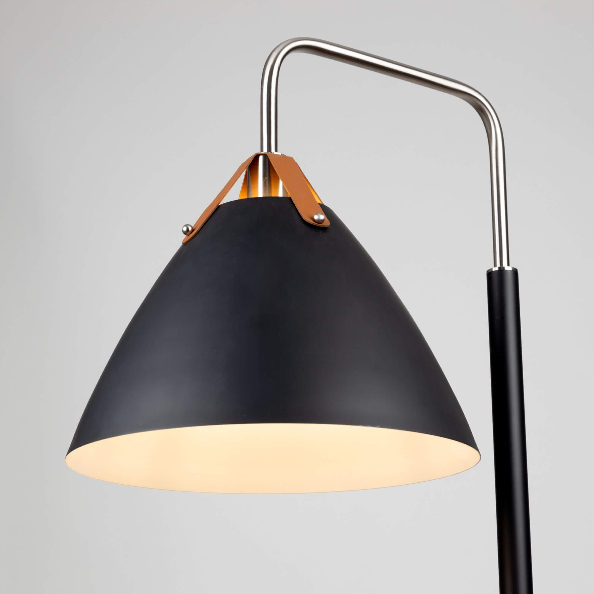 From designer Steven Sabados of S&C, the Tote collection is a definite fashion trend for your home or office décor. The matte black metal shades are suspended to the wiring with leather straps. The interior of the shades have a super reflective white finish for maximum light functionality. Two finishing touches for this design are the polished nickel accents, and the textile black wiring coverings. What a stunning floor lamp. (This collection has several hanging pendant options)