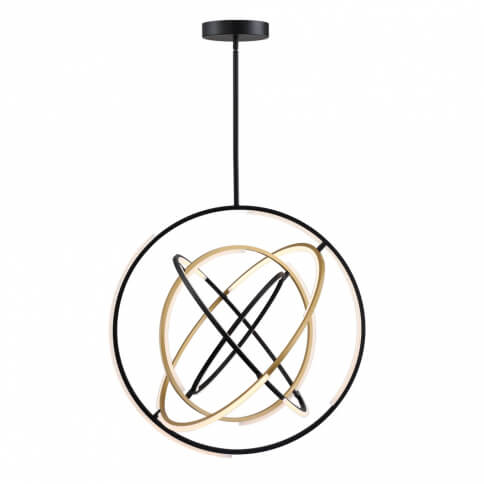 Designed by Kevin Kraemer, these orbs from the Trilogy collection are stunning. Black frames with a touch of brass - illuminated by LED on certain parts of the framing. Also these orbs can be adjusted to your desired position since the spheres can be rotated. 32" diameter chandelier shown. (There is also a smaller 24" version available)