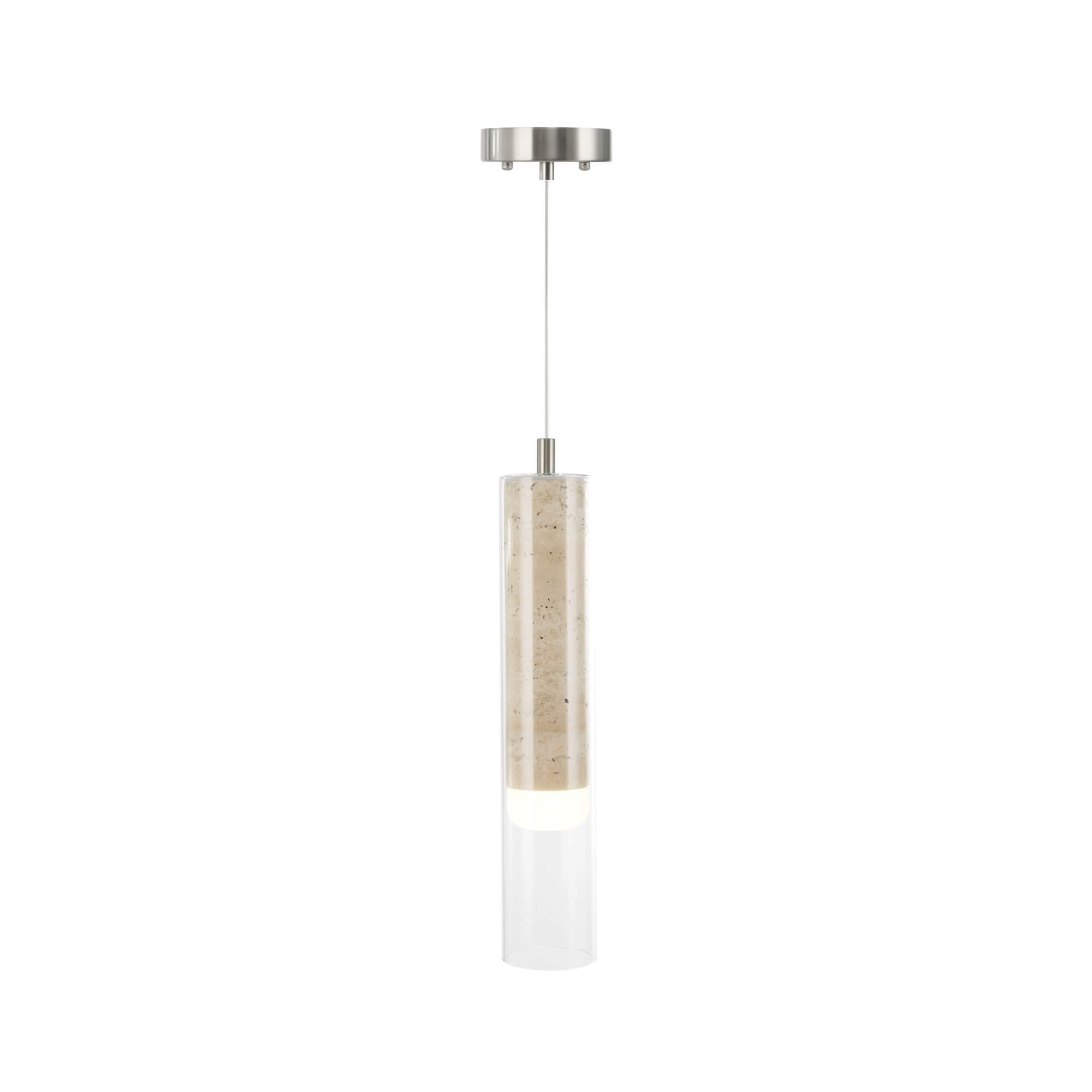 From designer Sarah Baeumler, the Zara collection features this elegant single pendant that showcases a stunning natural travertine column encased in clear glass. The fixture is anchored by a sleek plated brushed nickel canopy and matching hardware, providing a modern and refined aesthetic. For customized lighting, it includes an integrated LED 3CCT system, allowing you to easily adjust the color temperature to fit your space. This piece beautifully marries raw, organic textures with polished contemporary design to create a sophisticated focal point over a table, bar, or kitchen island.
