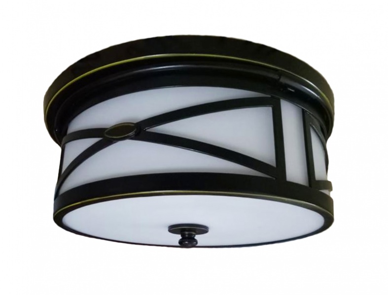 Description : DARK BRONZE FRAME FLUSH MOUNT WITH GOLD TRIMMING AND WHITE BOTTOM GLASS SHADE COVER