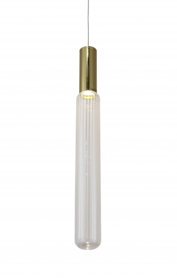 A CLEAR GLASS LED PENDANT LIGHT WITH GOLD HARDWARE
