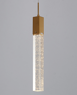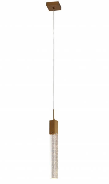 A GOLD FRAME SINGLE PENDANT LIGHT WITH A HANGING CLEAR BUBBLE BLOCK CRYSTAL