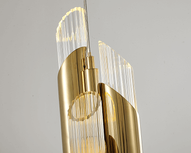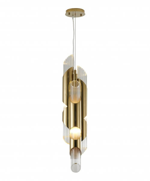 A GOLD STAINLESS STEEL PENDANT LIGHT WITH A CLEAR GLASS SHADE