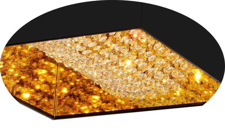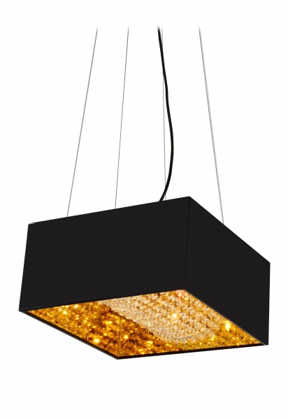Description : BLACK SQUARE BOX SHADE WITH GOLD INTERIOR AND CRYSTAL DRAPING