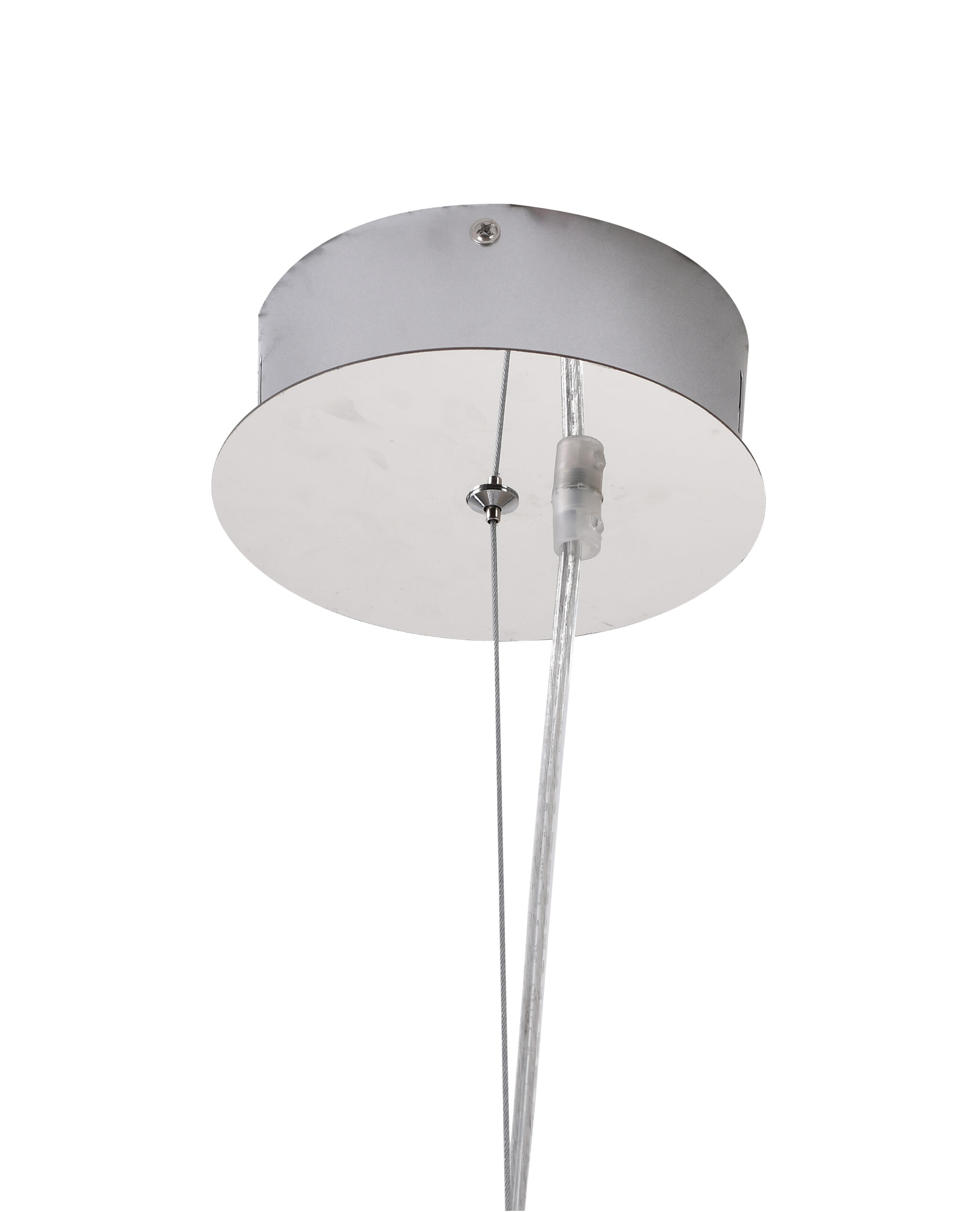 This LED single pendant lighting is in a chrome color, the frame is made out of acrylic, and the LED bulb is integrated into the frame. It also comes with chrome metal hardware, and the adjustable cord link makes this fixture suitable for most ceiling heights.