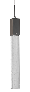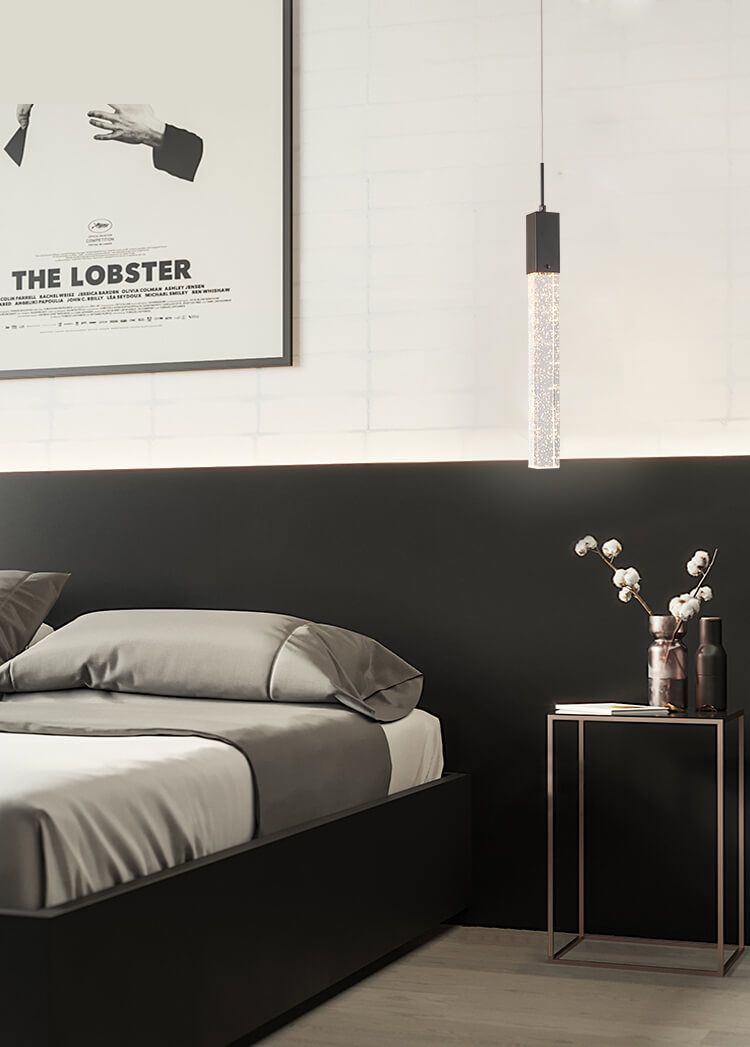 A MATTE BLACK FRAME SINGLE PENDANT LIGHT WITH A CLEAR BUBBLE CRYSTAL