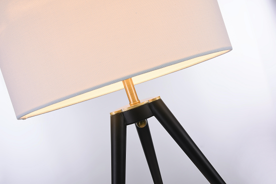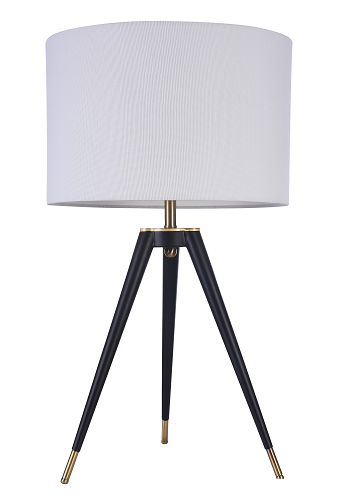 Description : BLACK FRAME WITH BRASS HARDWARE TABLE LAMP WITH A WHITE LINEN DRUM SHADE