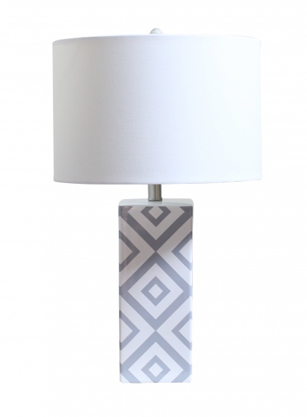 Description : WHITE AND GREY CERAMIC BODY WITH A WHITE LINEN FABRIC SHADE TABLE LAMP