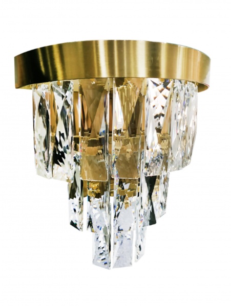 A GOLD METAL FRAME WALL SCONCE WITH CLEAR HANGING CRYSTALS