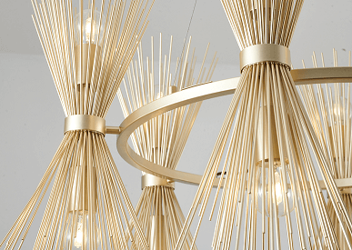 A ROUND GOLD IRON FRAME CHANDELIER WITH SPIKED CONE SHADES