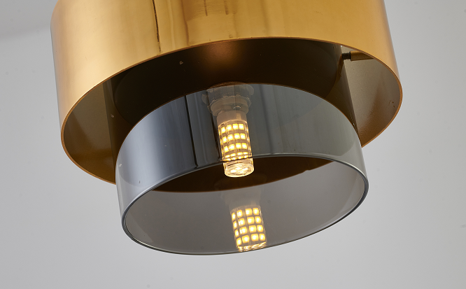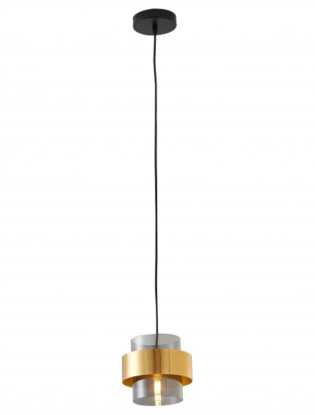 A GOLD PLATED SINGLE PENDANT LIGHT WITH A ASH GREY GLASS SHADE & BLACK HARDWARE